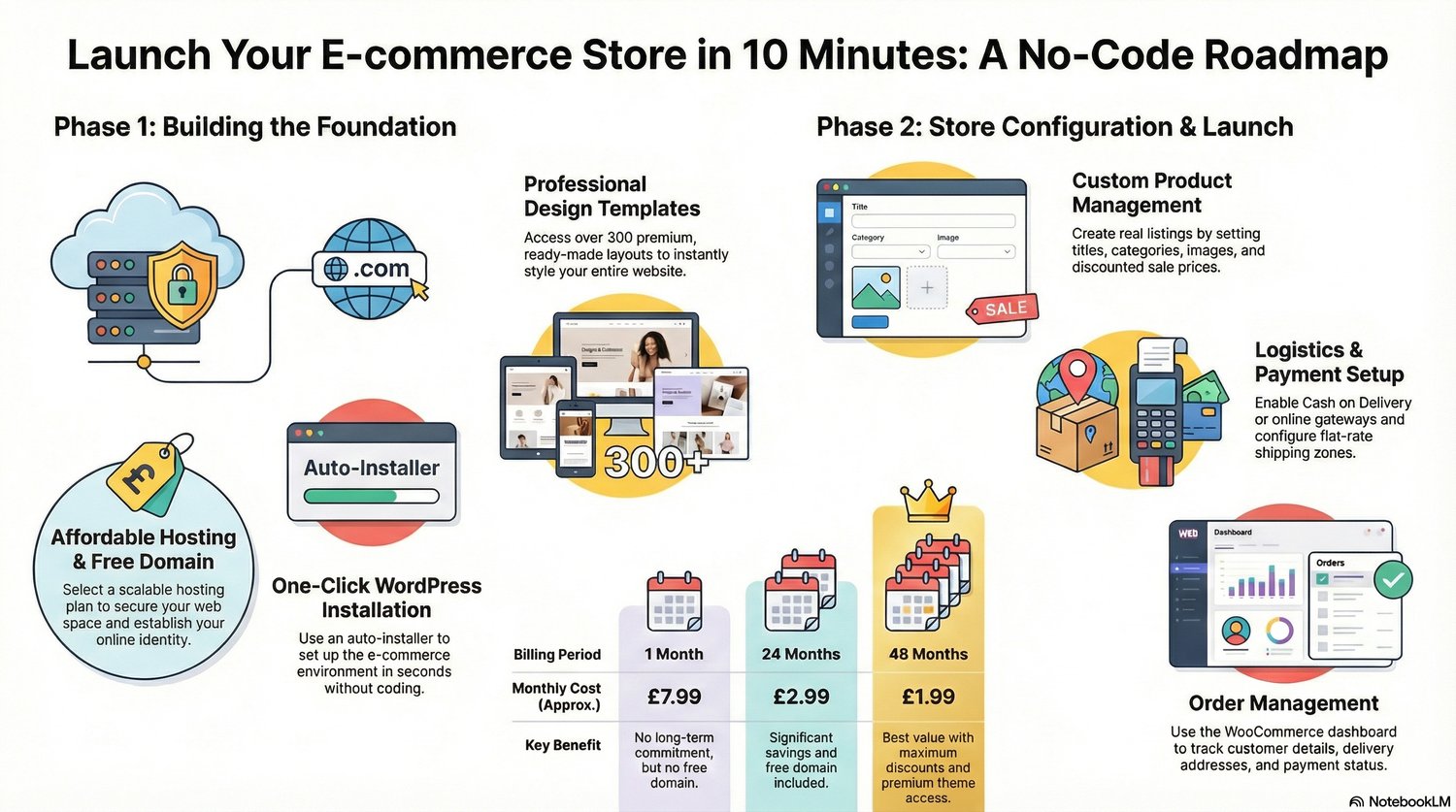 This guide walks you through the entire e-commerce setup process—from choosing hosting and a free domain to installing WordPress, designing your store, adding products, setting up payments, and managing orders.