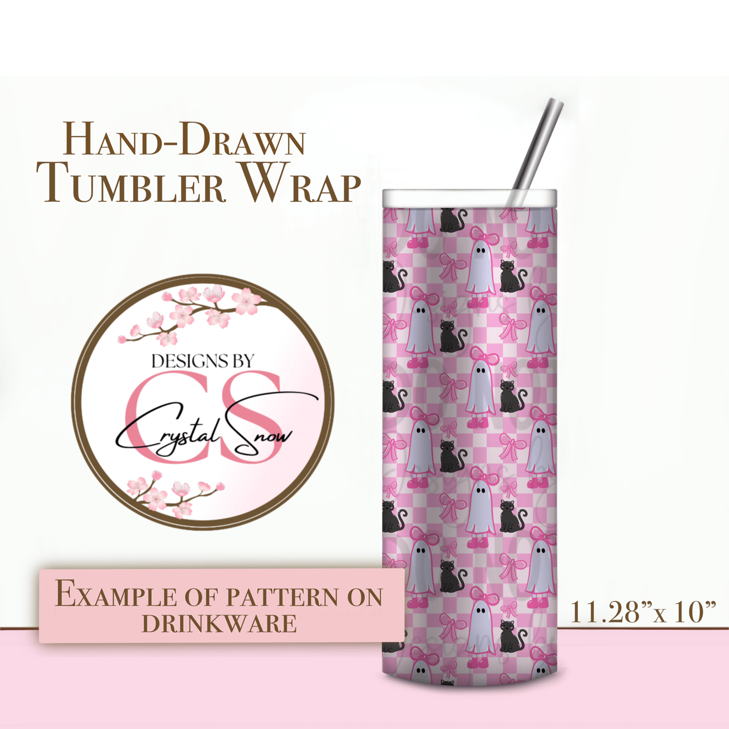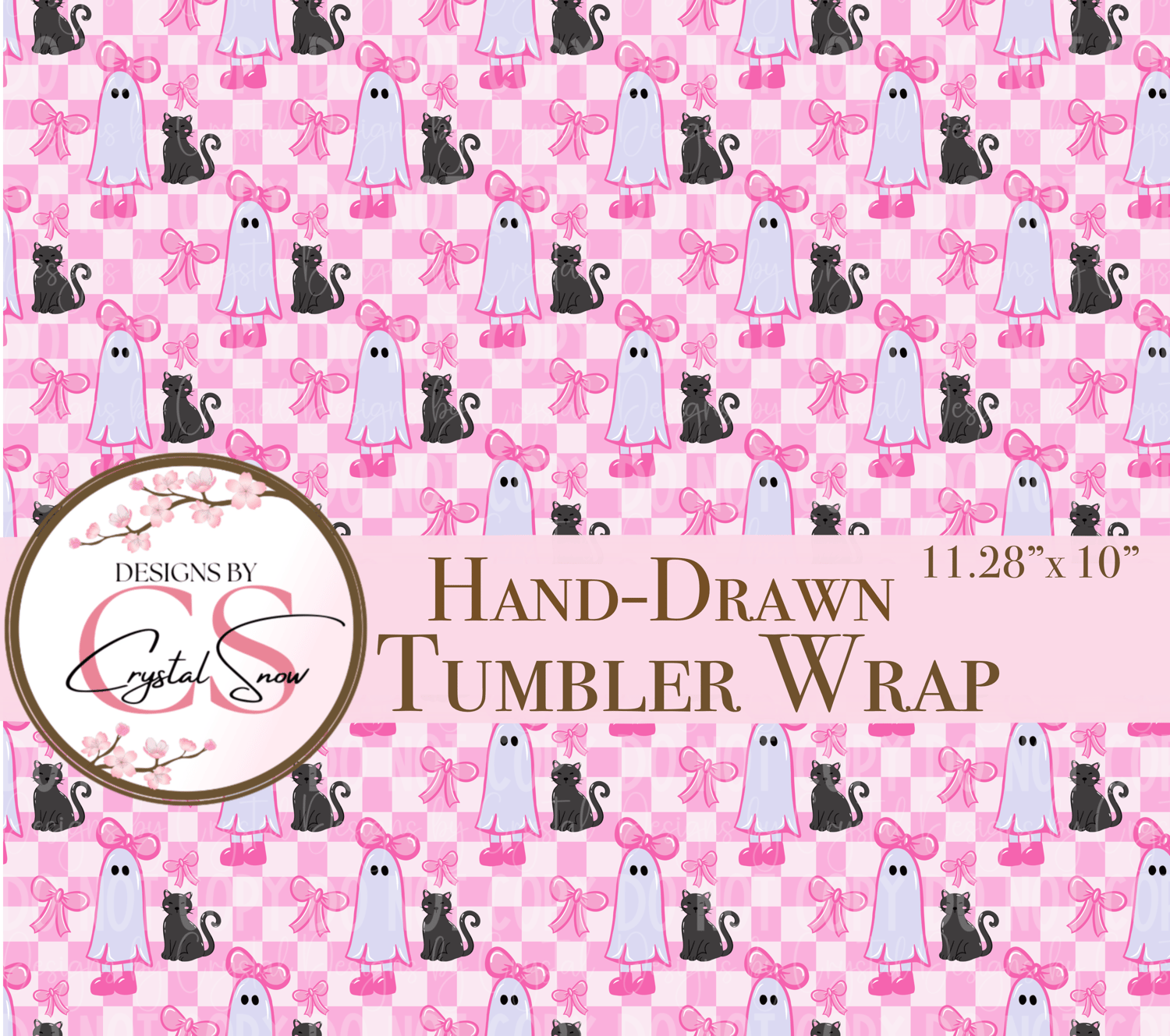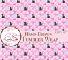 This hand-drawn tumbler wrap features pastel pink checkerboard with girly ghosts, big bows, and black cats for the ultimate spooky-cute vibe. It’s the perfect mix of sweet and spooky for Halloween drinkware projects, party favors, or small business seasonal designs.