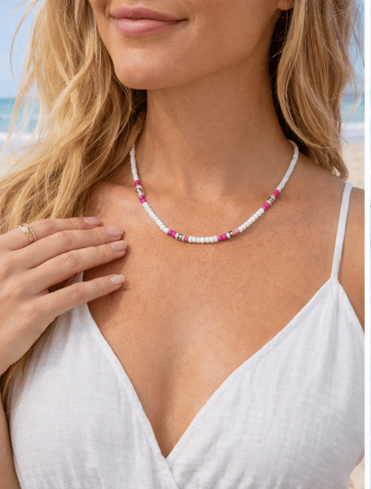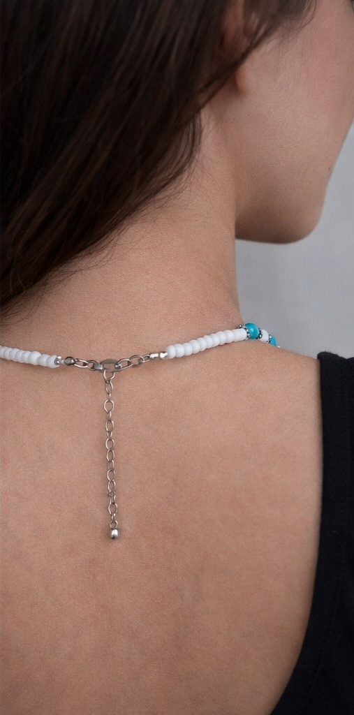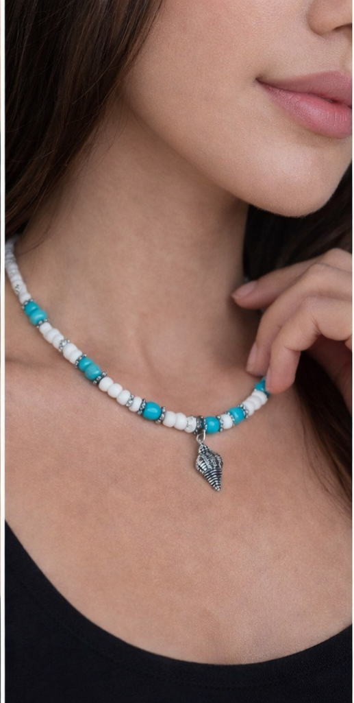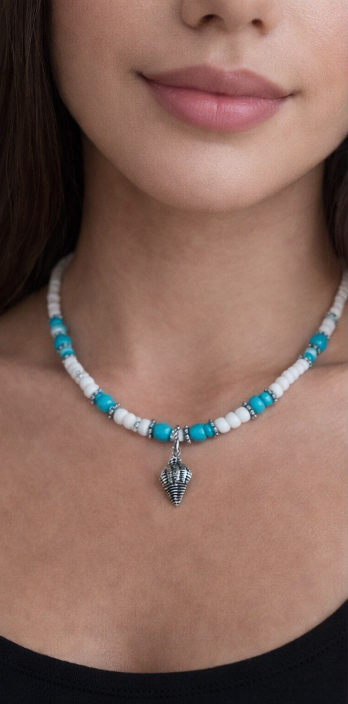 Bring effortless beach energy to your everyday look with this handmade turquoise and white beaded necklace featuring a detailed silver seashell charm. Designed with crisp white seed beads and vibrant turquoise accents, this piece captures the relaxed beauty of the ocean in a timeless, wearable style.