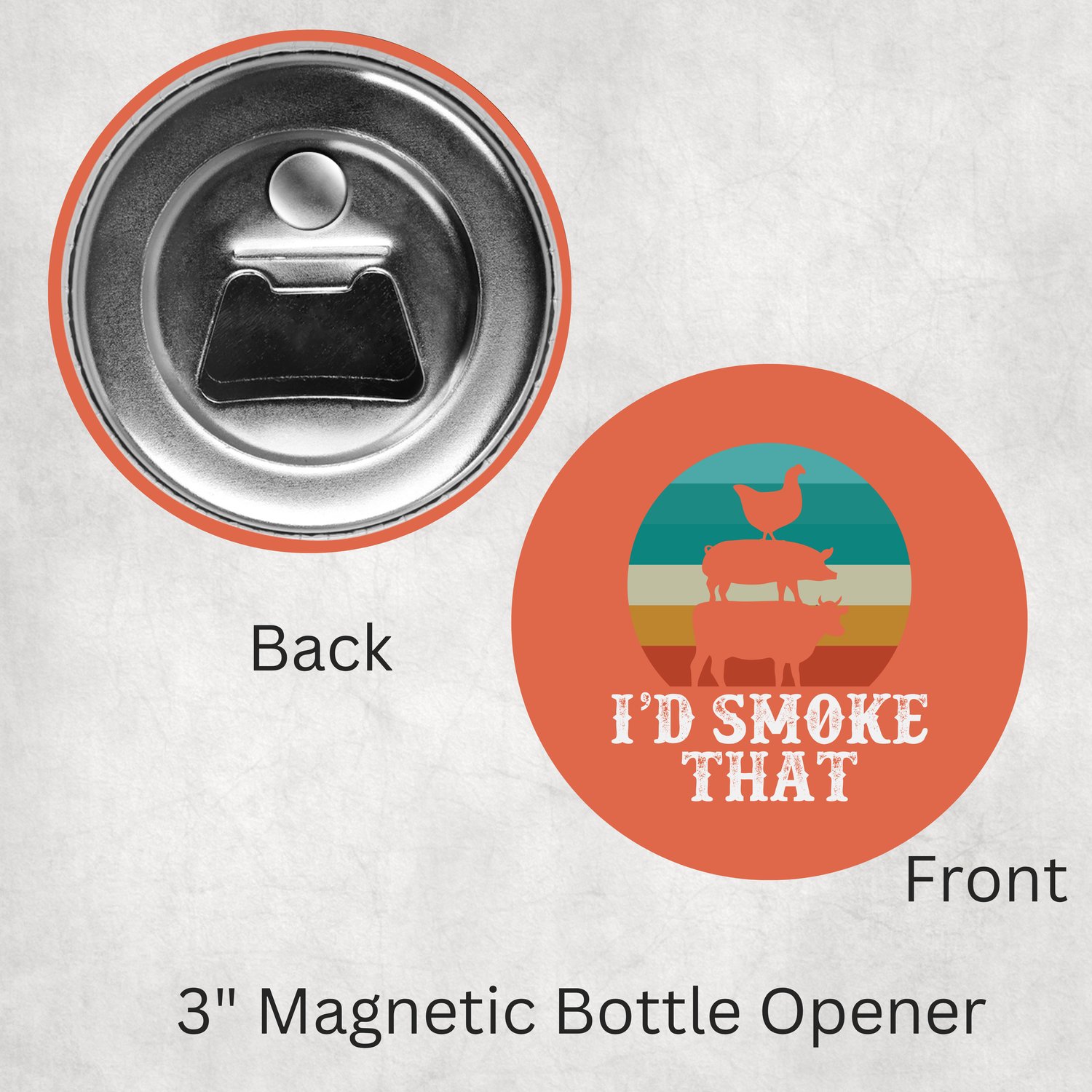 Bottle Opener Magnet is 3" round. Imaged on the front side and on the back side is a magnet and bottle opener. These magnets are great for the kitchen, BBQ area or make excellent gifts.