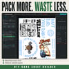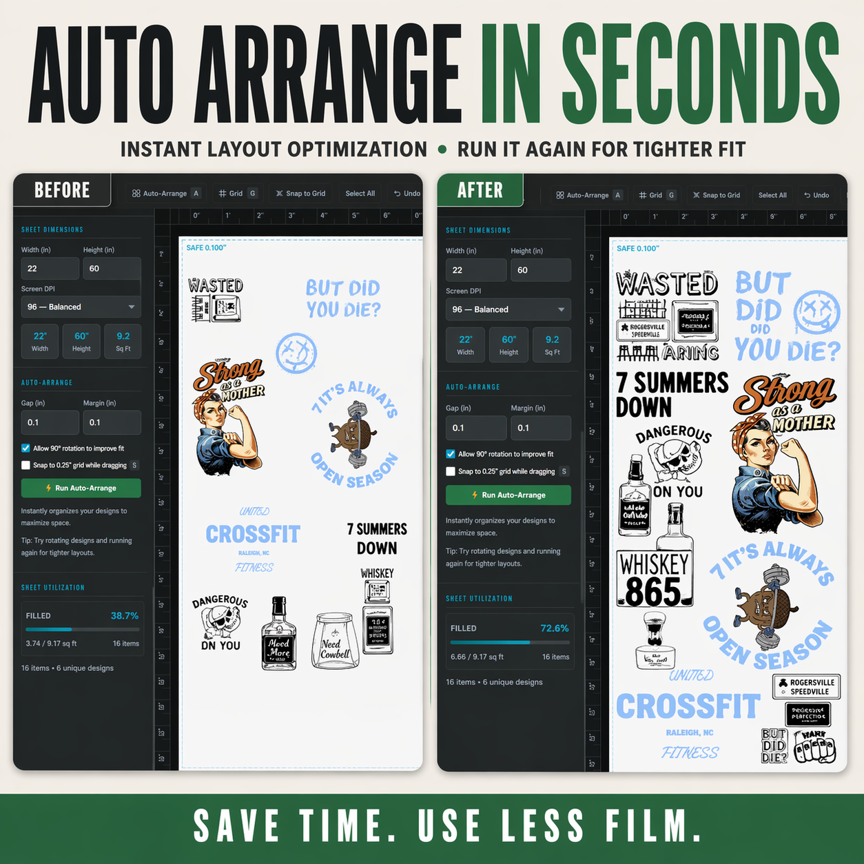 Auto-Arrange — bins your designs for maximum sheet utilization using a real packing algorithm. Shows fill % and sq ft used so you know exactly what you're sending.