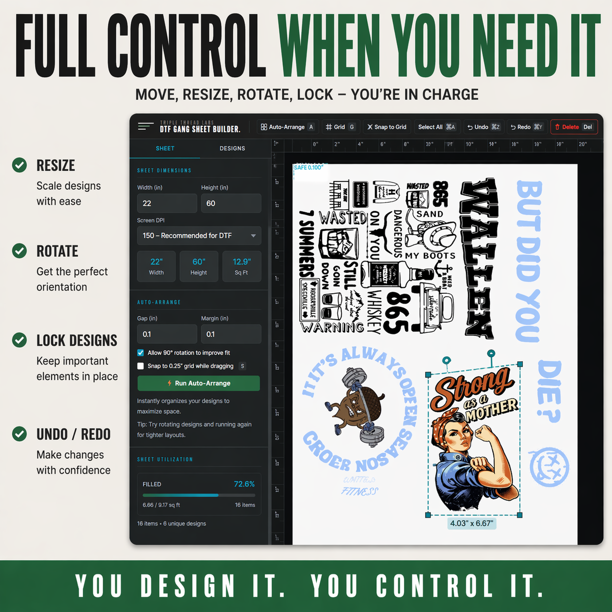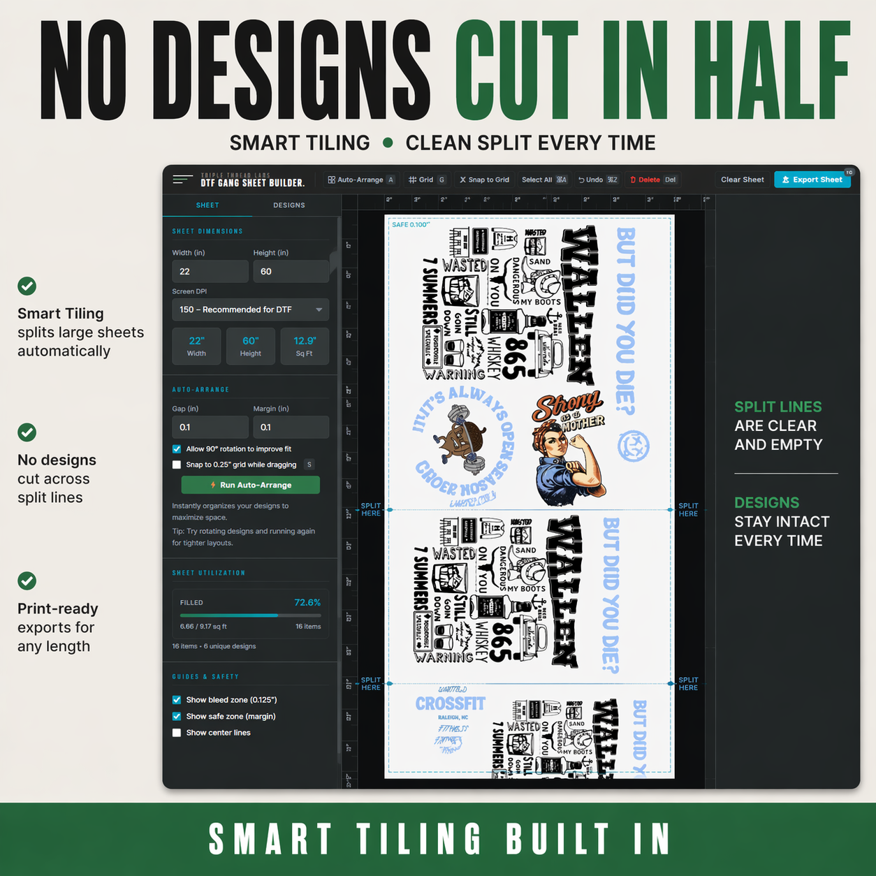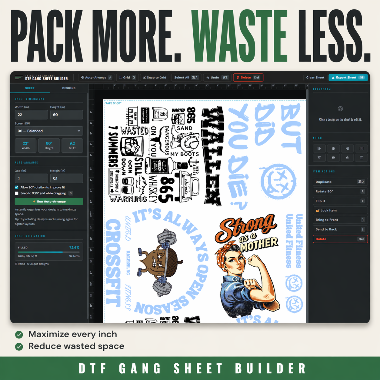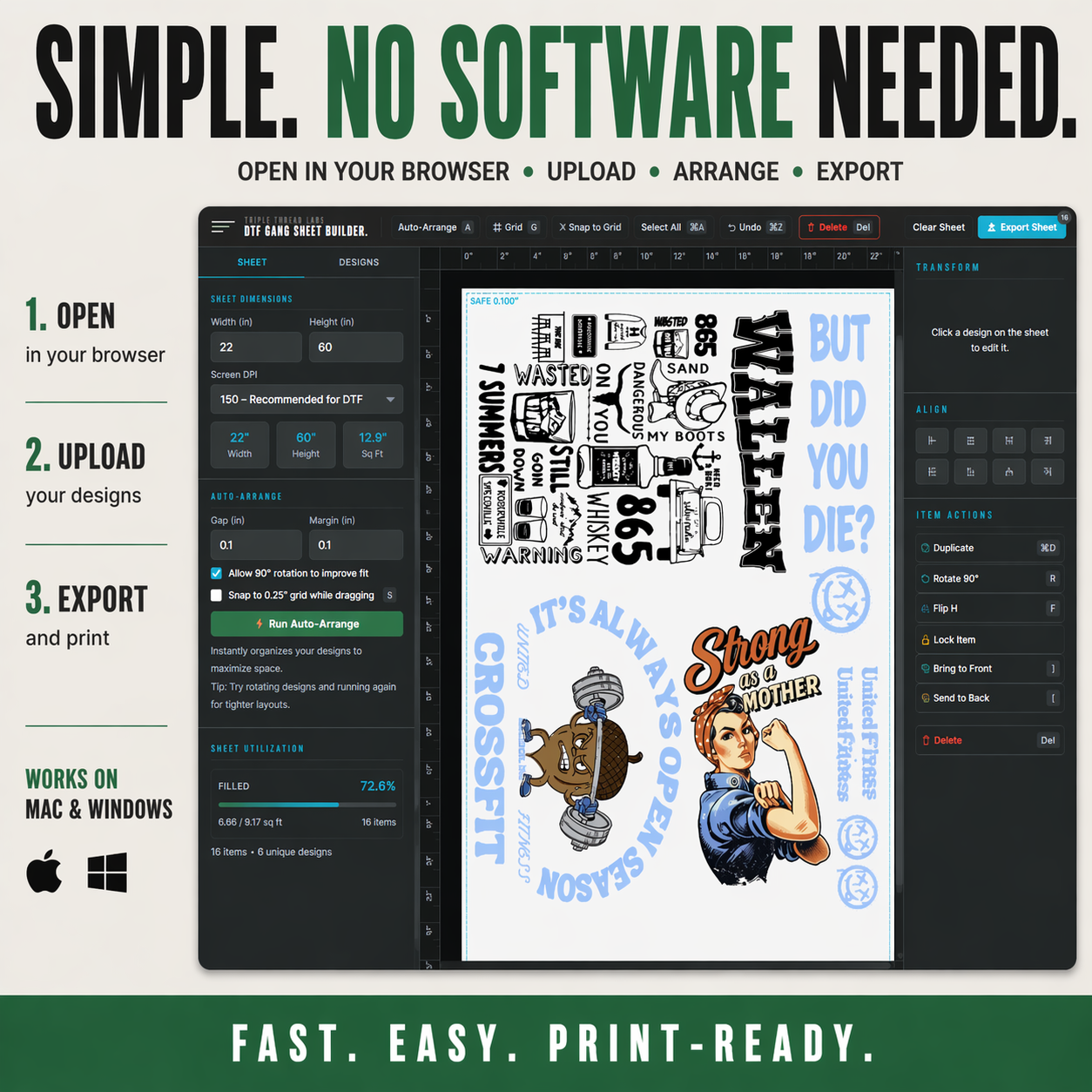 DTF Gang Sheet Builder - Drag and Drop Canvas Auto-Arrange Tiled Export - Works Offline Any DTF Supplier - No Subscription