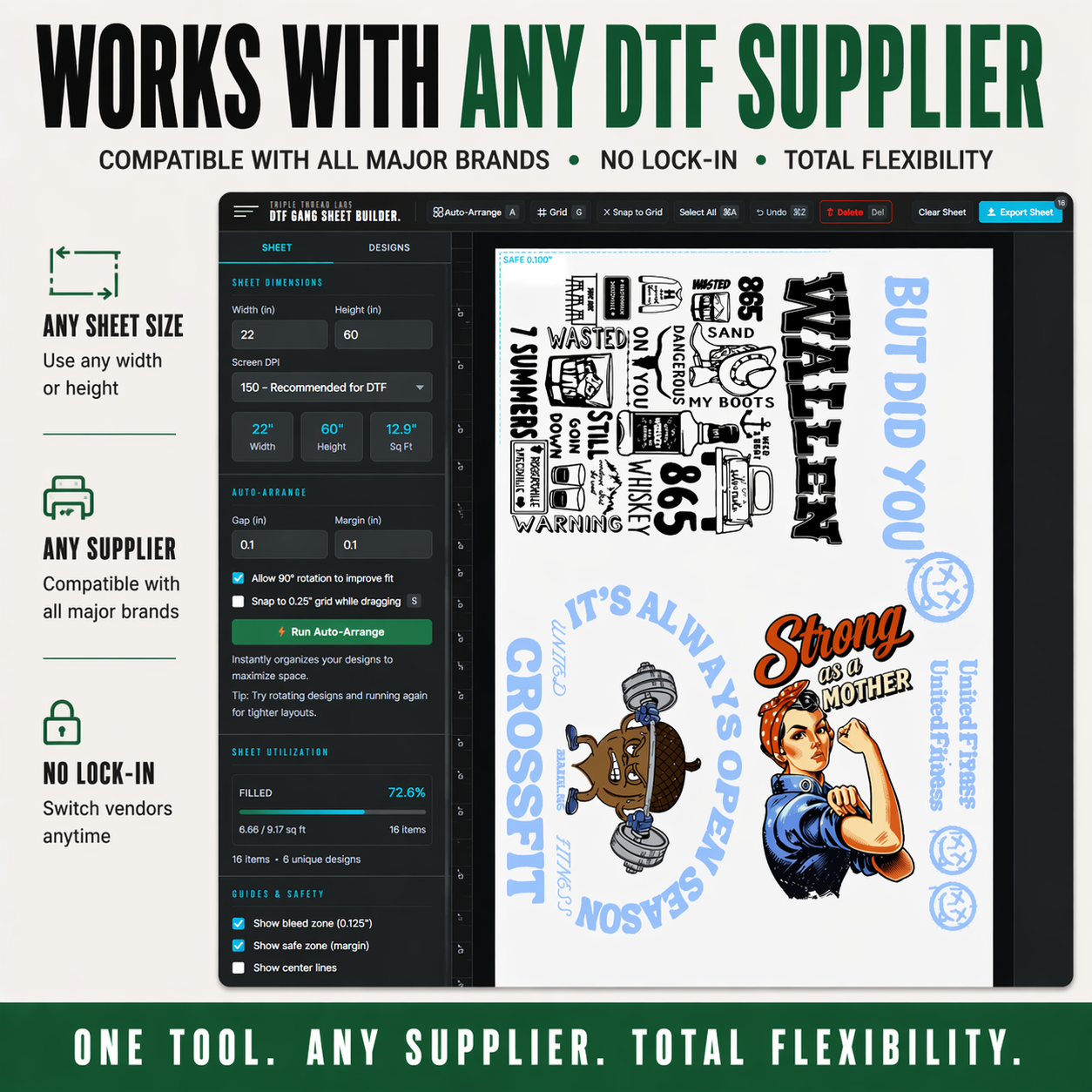 Works with any DTF supplier. Runs in your browser. Buy once, yours forever.