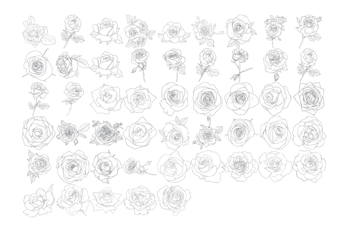 Rose Outlines Procreate Brush Stamps Set 1, 50 Rose Outline Brushes