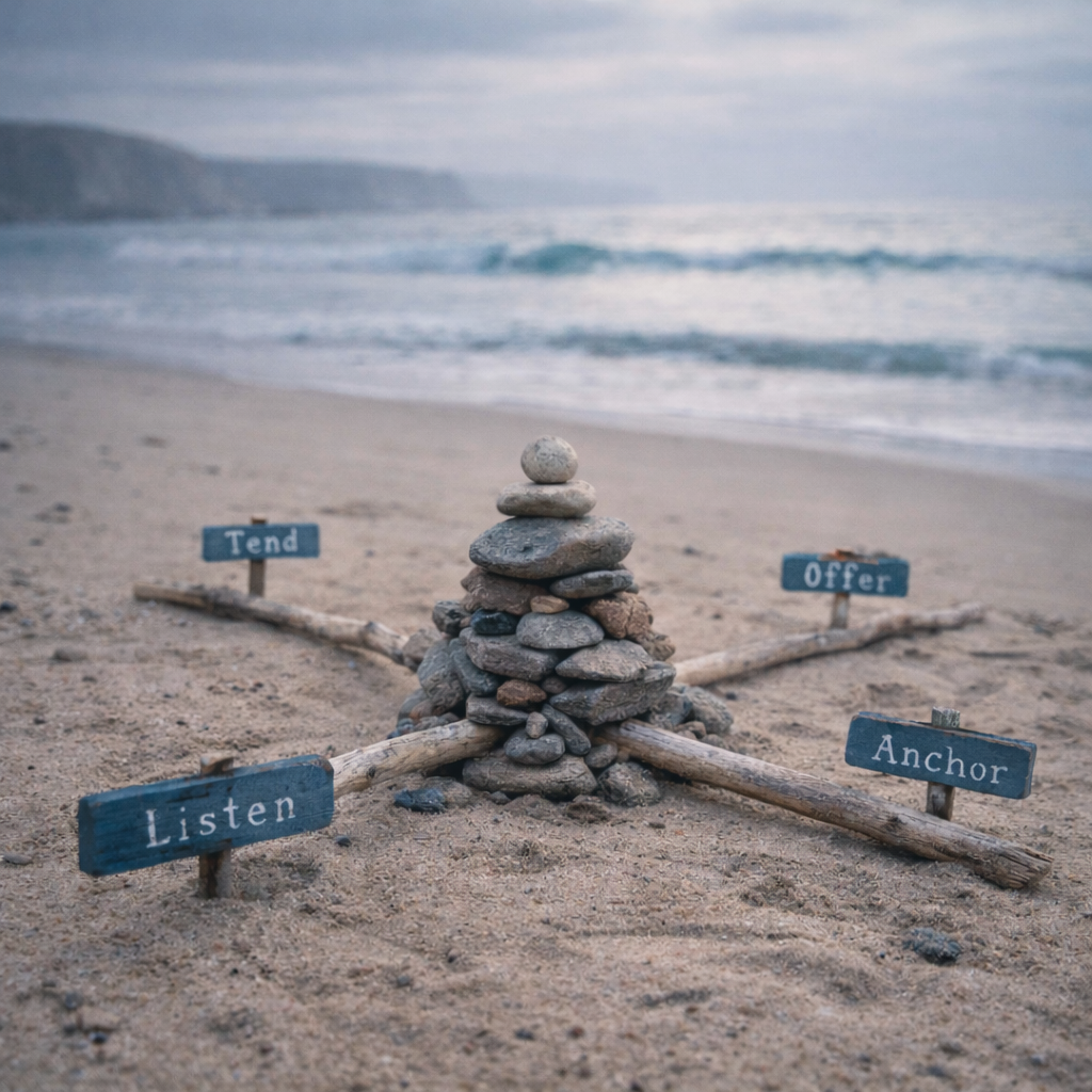 The Drift Compass is a soft tool for inner orientation. It offers a gentle, structured practice for finding your footing and listening to what is stirring within. Based on four simple postures—Listen, Tend, Offer, and Anchor—this practice guides you back to a place of quiet clarity.