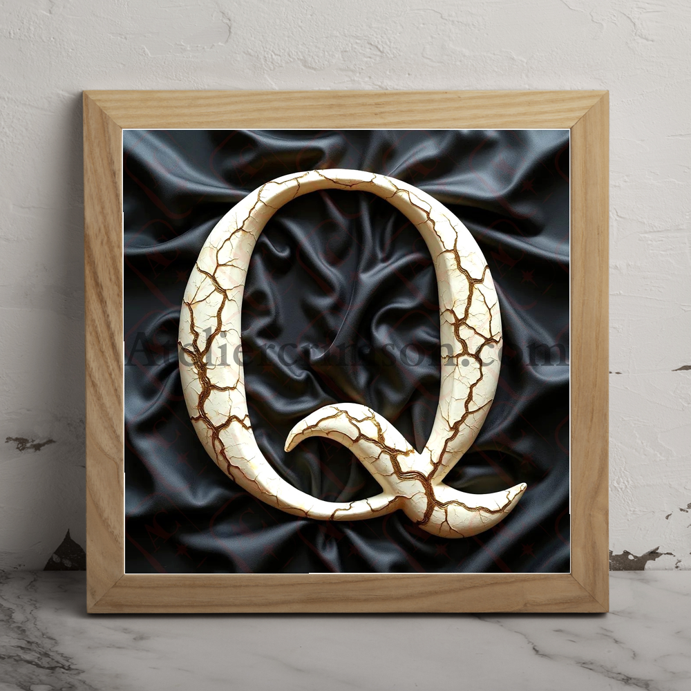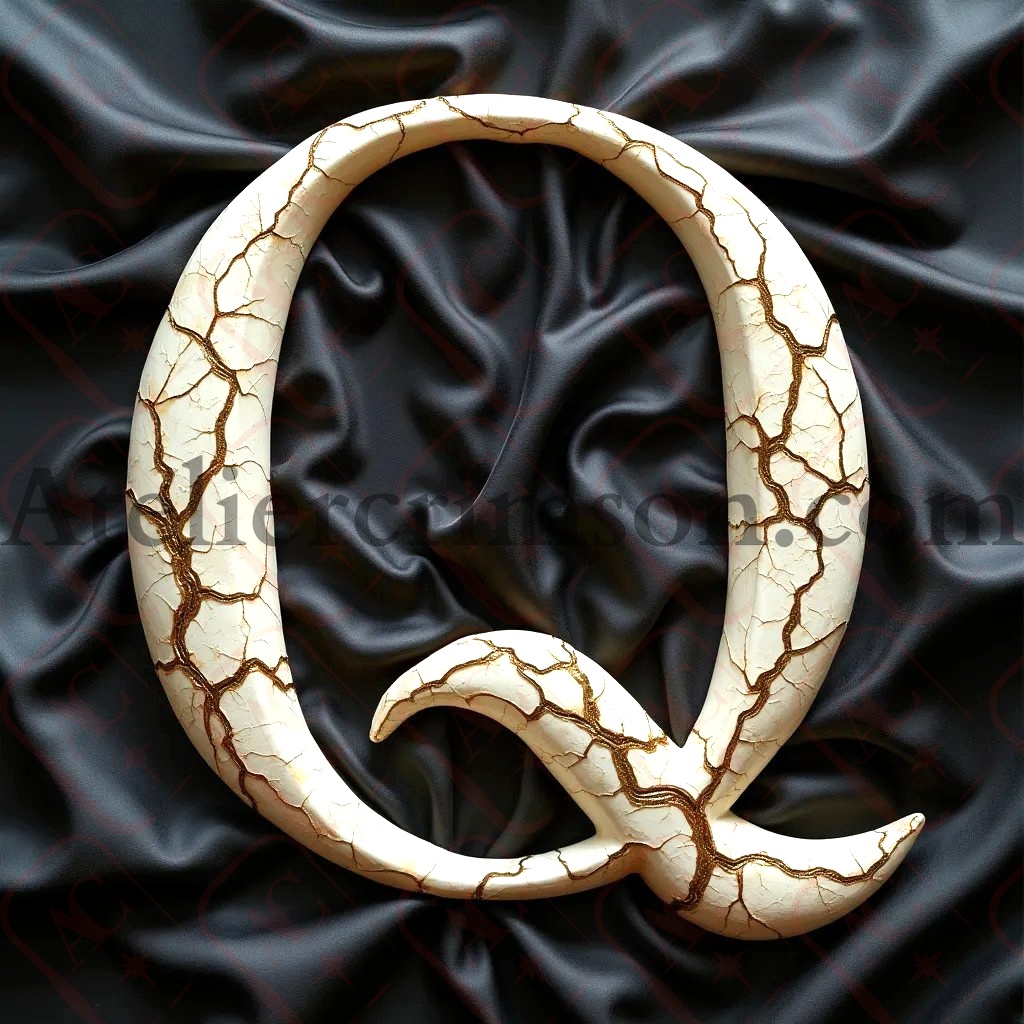 The letter Q Bones with gold fissures A hauntingly beautiful character crafted from pristine human femur bones, intricately arranged to form a bold, serif typeface. Delicate golden fissures, reminiscent of kintsugi art, weave through the ivory-white osseous structure, adding an element of elegant repair. The character stands proudly on a luxurious marbled floor, its form casting subtle shadows. Behind it, a textured black linen backdrop provides a striking contrast, emphasizing the letter's ethereal beauty.