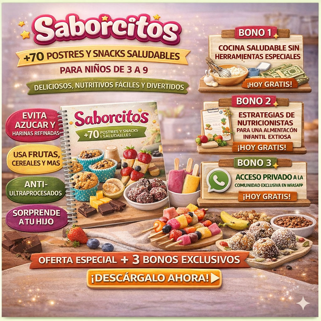 Con Saborcitos aprenderás a preparar postres saludables para niños, fáciles, rápidos y deliciosos, usando ingredientes reales que ya tienes en casa 🏡✨.