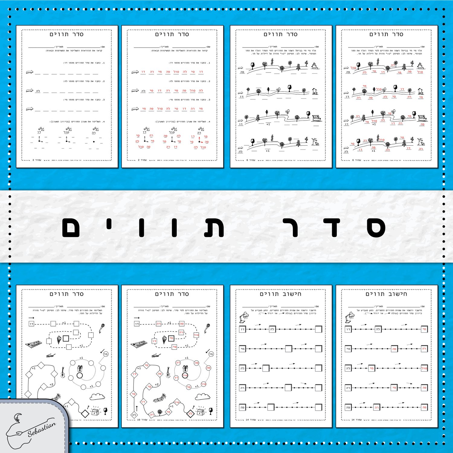 הערכה עם דפי עבודה "סדר תווים" מאת סבסטיאן סקיבה מיועדת ללימוד פרקטי של סדר תווים הלוך, סדר תווים חזור, סדר תווים עם הערות דילוג על תו או על שני תווים.