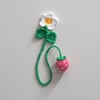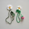 This delicate and charming design uses very little yarn, making it the perfect scrap yarn project. It’s also an instant-gratification project, as it works up in no time and requires sewing only for the stem to the strawberry. Featuring a cute strawberry fruit and a long stem with two leaves and a pretty t5 petal white flower, it adds a touch of yarn, nature, and whimsy to any book.