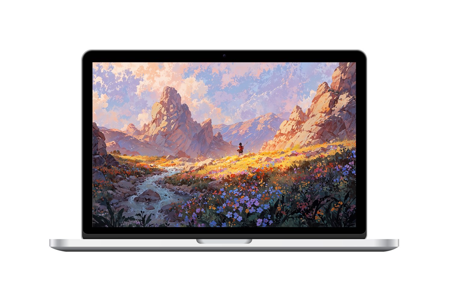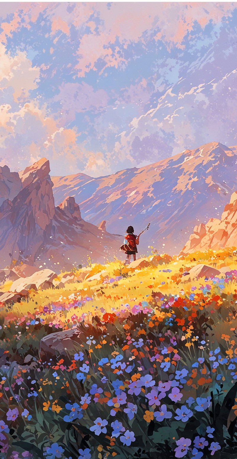 Introducing a new desktop wallpaper that invites you to step into a world of color and adventure. 🌈 A small figure stands on a cliff, gazing out at the breathtaking landscape where vibrant hues of pink, orange, and blue fill the sky at sunset. Below, lush forests, dotted with wildflowers in every shade imaginable, stretch toward a sparkling river that mirrors the colors above. In the distance, rolling hills and towering mountains bask in golden warmth, making it impossible not to feel the excitement and wonder of the great outdoors. 🌿✨