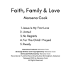 A collection of 5 original songs written by gospel artist Marsena Cook, "Faith, Family And Love" encourages faith and love for the Lord; and demonstrates the expression of His love in marriage and family life: