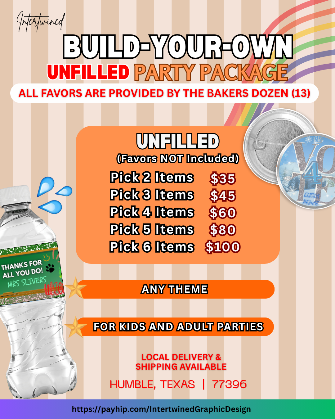 Unfilled party favors come fully printed, designed, cut, and ready for you to assemble with your own snacks, candy, and treats! Each set includes 13 favor sleeves of the item you selected (baker’s dozen).