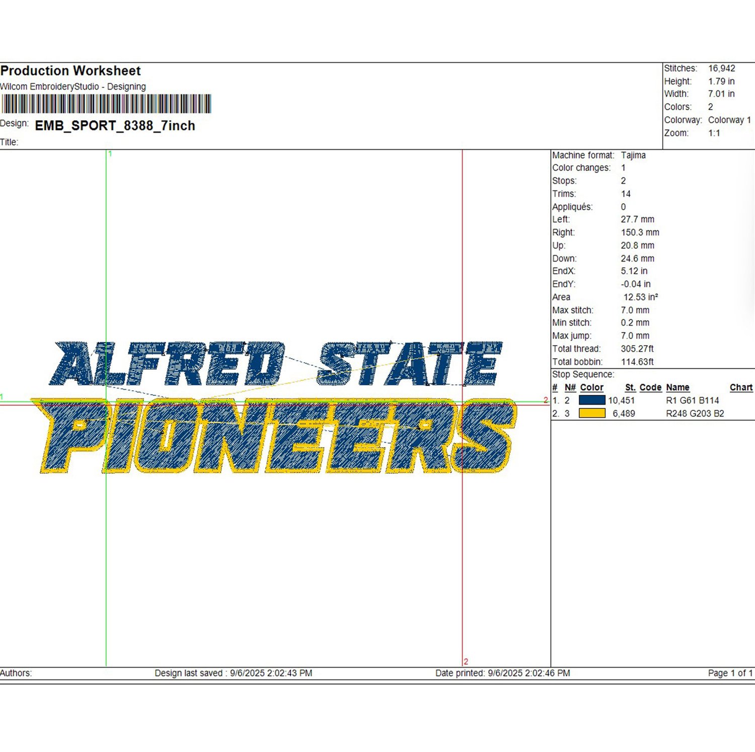 Alfred State Pioneers College Football Team Wordmark Logo Embroidery Designs, Ncaa Embroidery Files, NCAA Alfred State Pioneers Team Logo Embroidery, Game Day Machine Embroidery Design, Digital Download