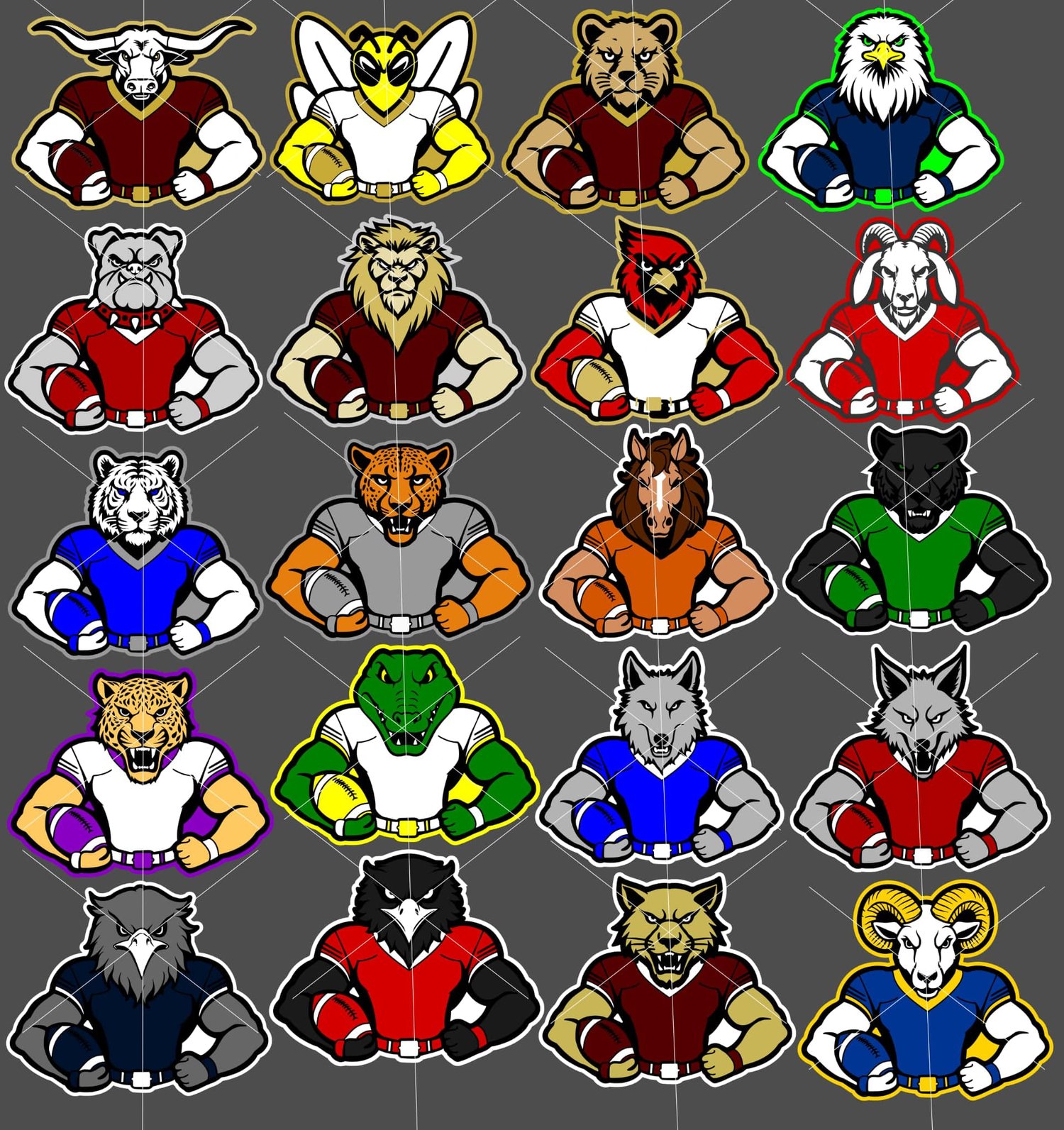 Show off your team pride with this Football Mascot SVG Bundle! This ZIP file includes 20 high-quality SVG designs perfect for homecoming mums, garters, and school spirit crafts.