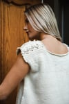 Casera’s lace-and-bobble saddles are knit first, then the front and back are picked up from the long edges and worked down to the underarms, where they’re joined together and knit in Stockinette in the round to the curved, split hem. A loose gauge and wide armholes give this piece drape and a relaxed fit.