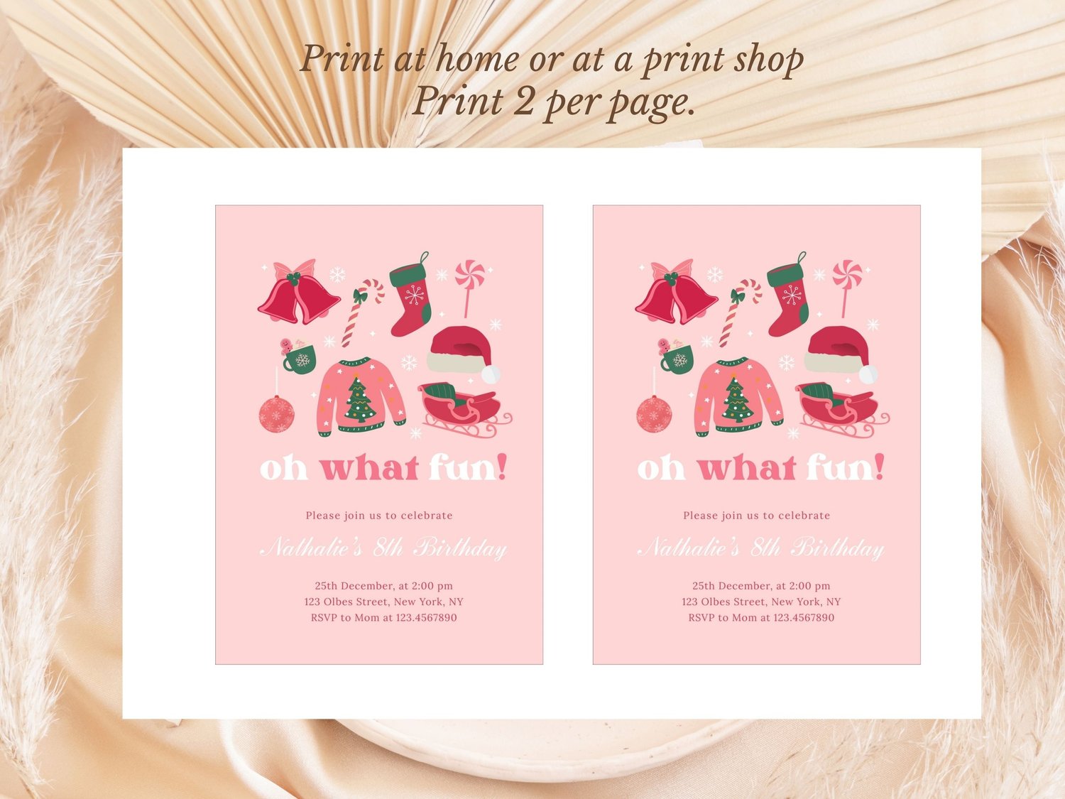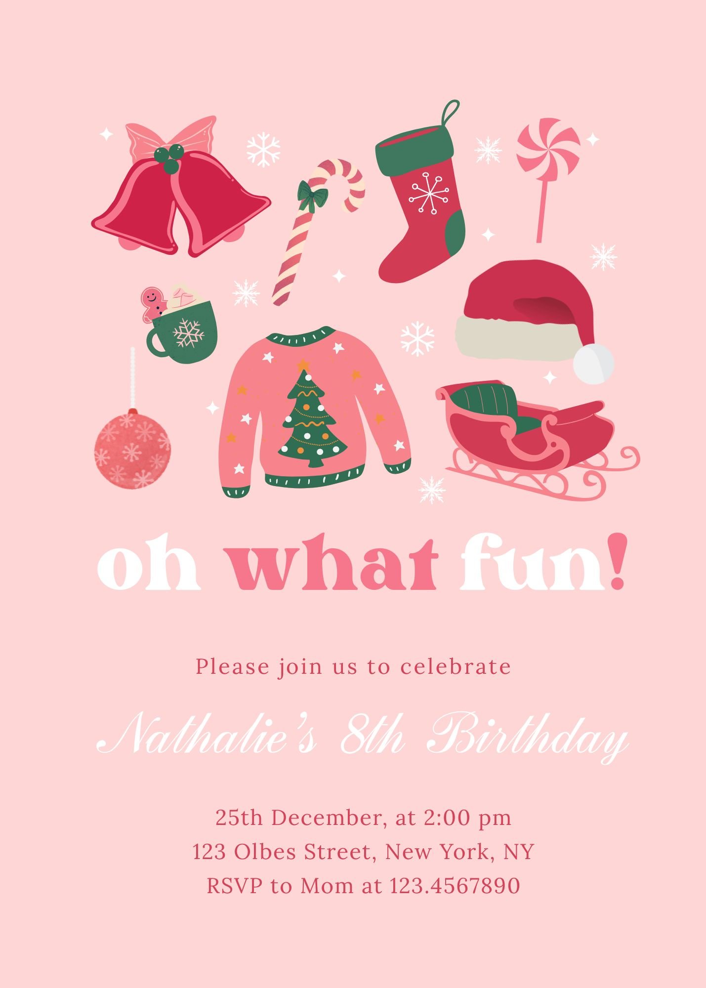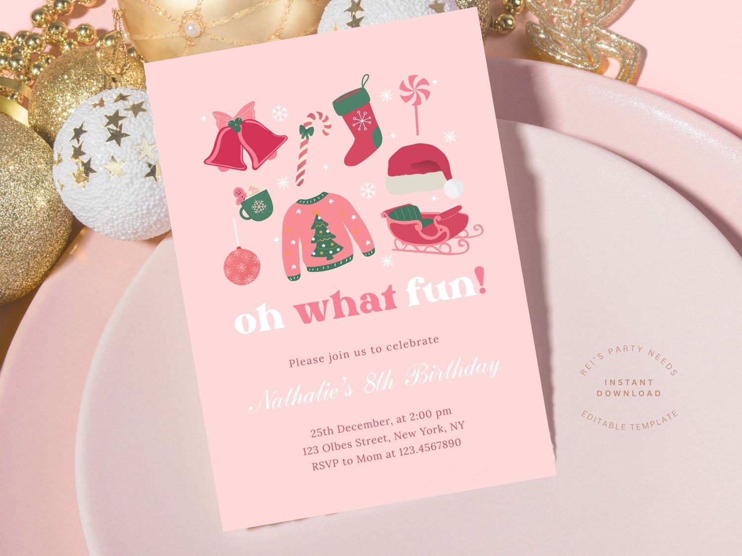 Pink Christmas Birthday Party Invite, Editable and Printable Girl Holiday December Birthday, Ugly Sweater Birthday, Santa Hat, Christmas Sock, Candy Cane