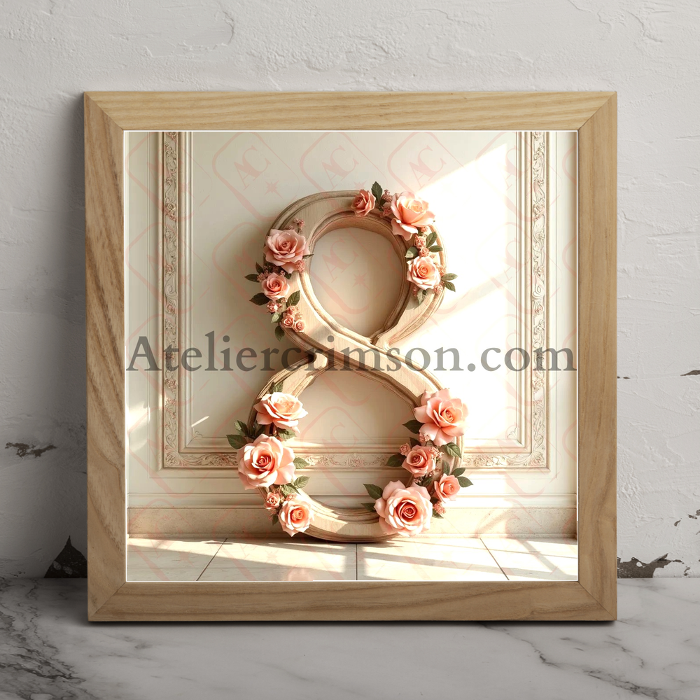 Number 8 soft beige wood and flowers Download now this AI-generated image of an elegant, mid-century style character crafted from wood with a soft, neutral background with geometric pattern. Nostalgic and elegantly worn atmosphere.