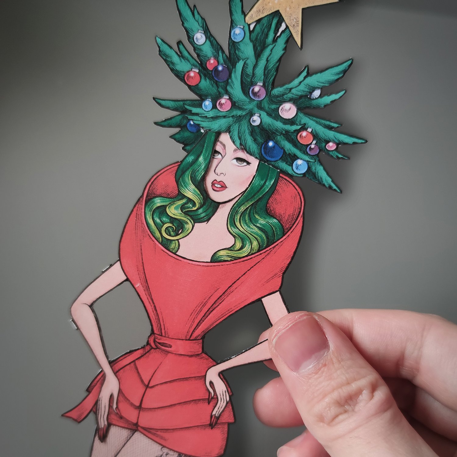 This digital download includes one A4 size page with a base doll, a pair of boots, a dress and a Christmas tree headpiece.
