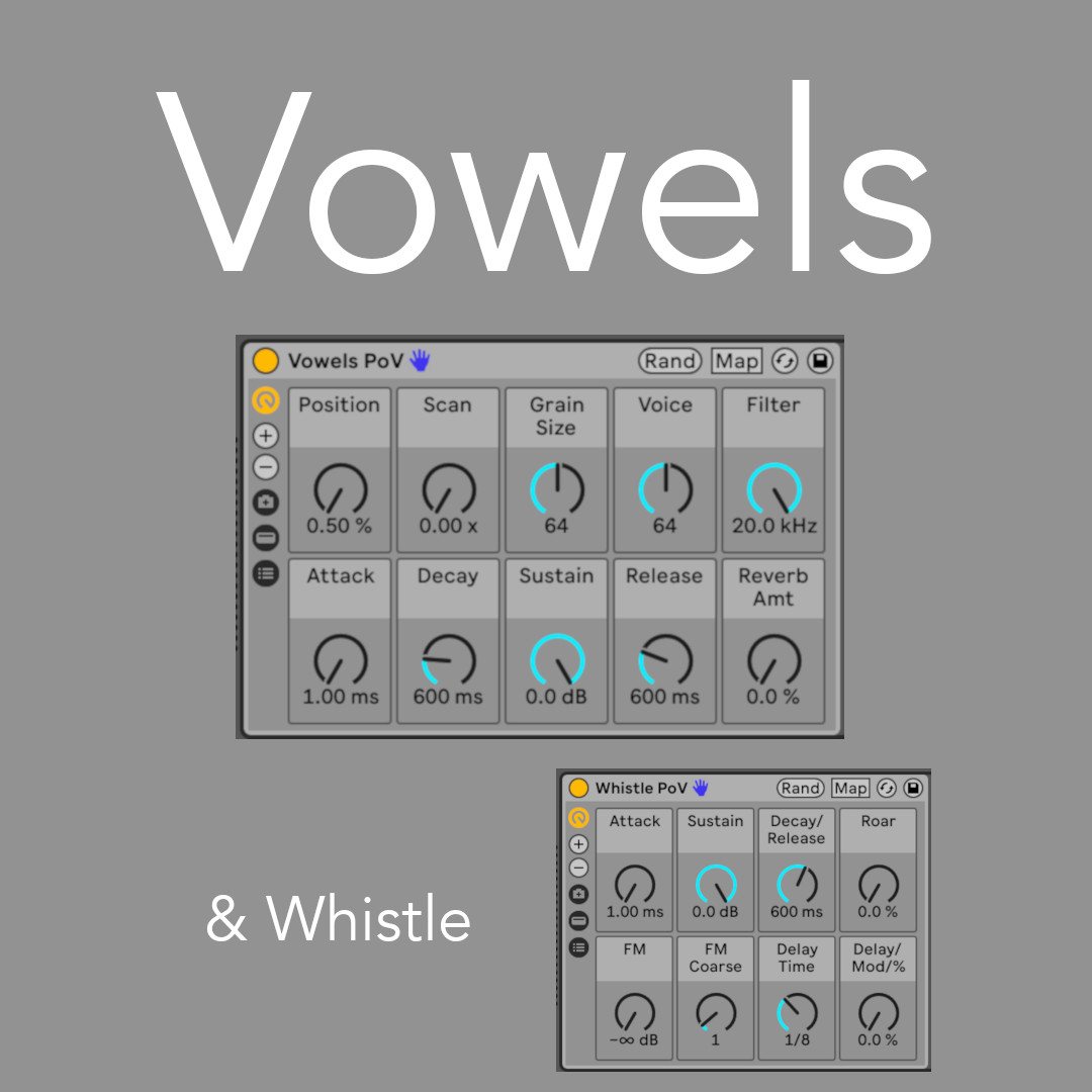 Vowels is an Ableton Live instrument rack that uses Granulator 3 and Hybrid Reverb to create vocal "ooos, aaahs, eees" etc. soundscapes. Whistle is an extra rack included that uses Sampler, Shifter and Roar. Requirements are the latest version of Ableton 12.1 Suite with Granulator 3 installed. See video details: https://youtu.be/DYQfcZ2SHi4