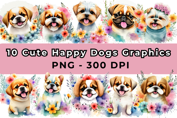 10 Cute Happy Dogs Graphics PNG files in size: 5000 x 5000 pixels in 300 DPI with transparent background.