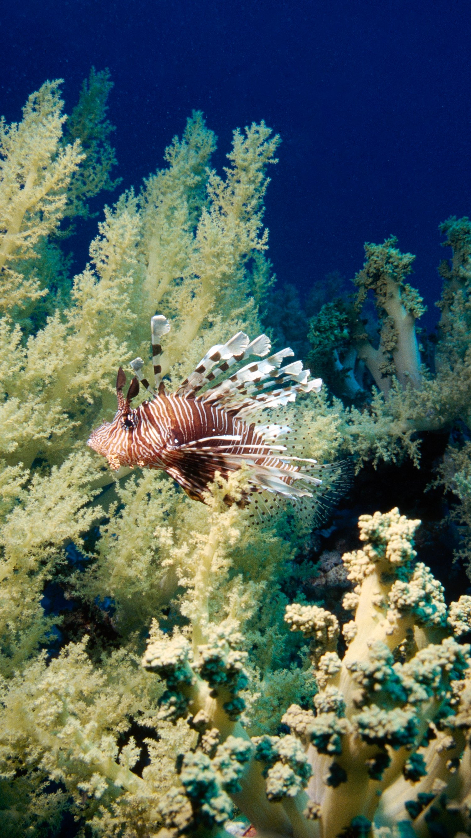 Bring the mystery of the deep to your screen. This shot features a majestic Lionfish in full display, its intricate stripes and venomous spines contrasting beautifully against a cluster of soft, golden-yellow coral. Behind the scene lies the deep, infinite blue of the Red Sea, creating a sense of depth and wonder that turns your phone into a personal aquarium.