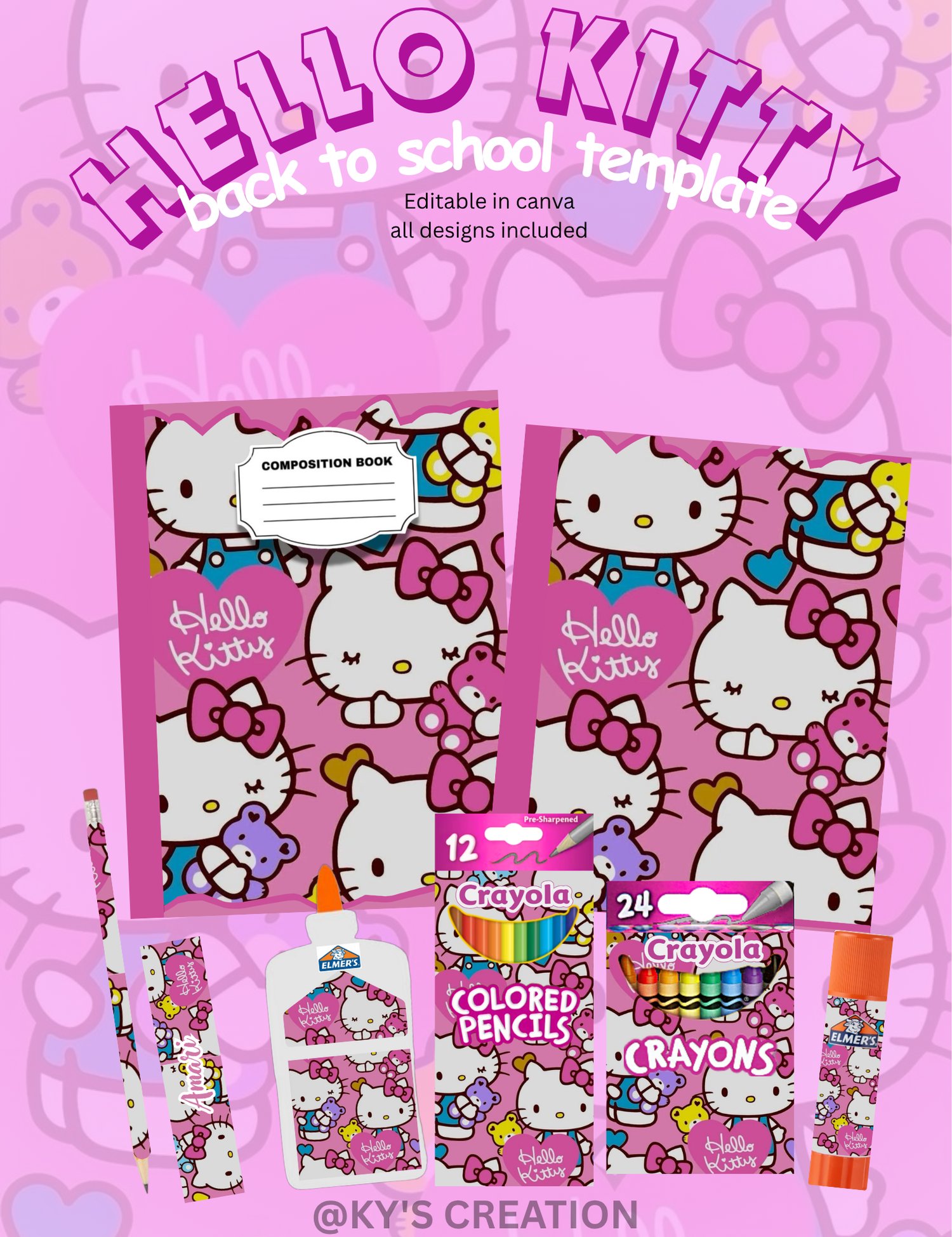 Hello Kitty Back to School Template Set | Digital Download | Pencil Wraps, Composition Book Cover, Glue Labels, Crayon Front Sticker & More