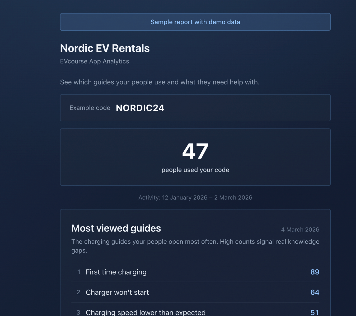 Get a company code that connects your people's EVcourse app usage to an analytics page. See which charging guides they open most and where the knowledge gaps are. One code, unlimited people, one year.