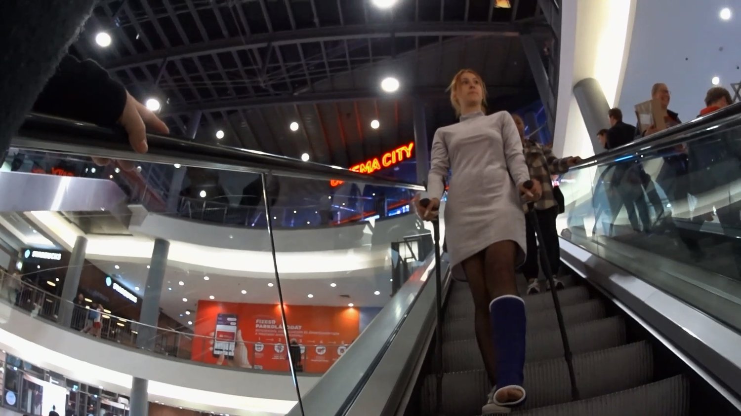 Fleur is on the way to a restaurant in the big Mall.She still has a purple short leg cast on her left leg.It´s a long way to crutch and we follow her both in the elevator and when she goes down a escalator.Sometimes she stop to rest and put her cast with her bare toes on top of her right sneaker.