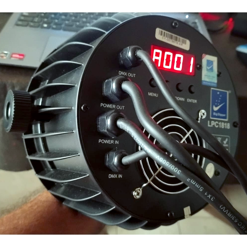 * En el modo A001 (con "A" como la tercer foto) Verifique, con un Fixture de pruebas (click), que coincidan estos canales: 1 Dimmer, 5 Verde Lima, 7 UV, 8 Strobo.