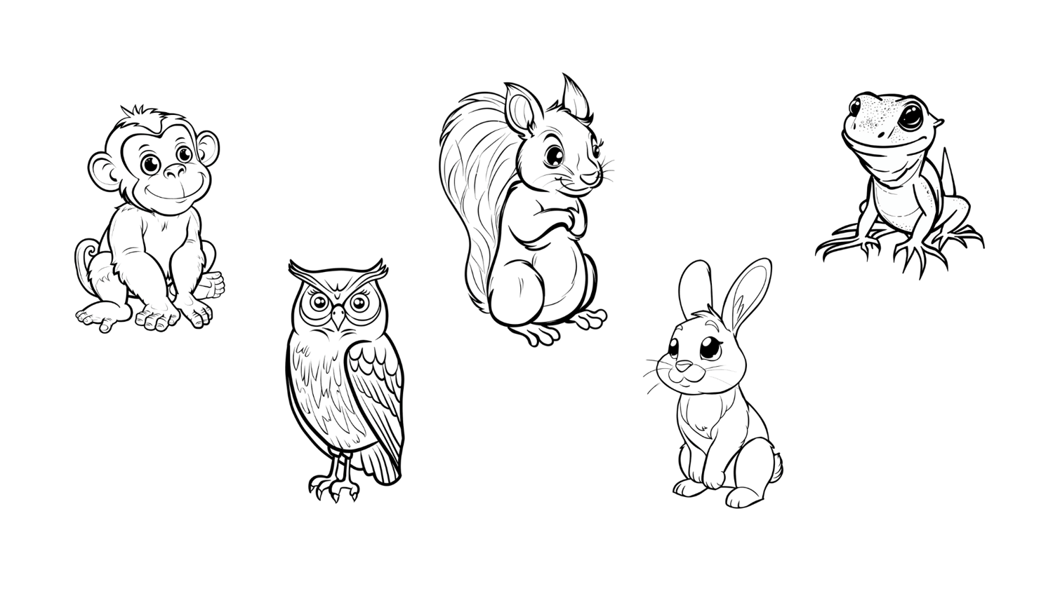Cute Animals Coloring- Squirrel, Rabbit, Owl, Monkey, Lizard
