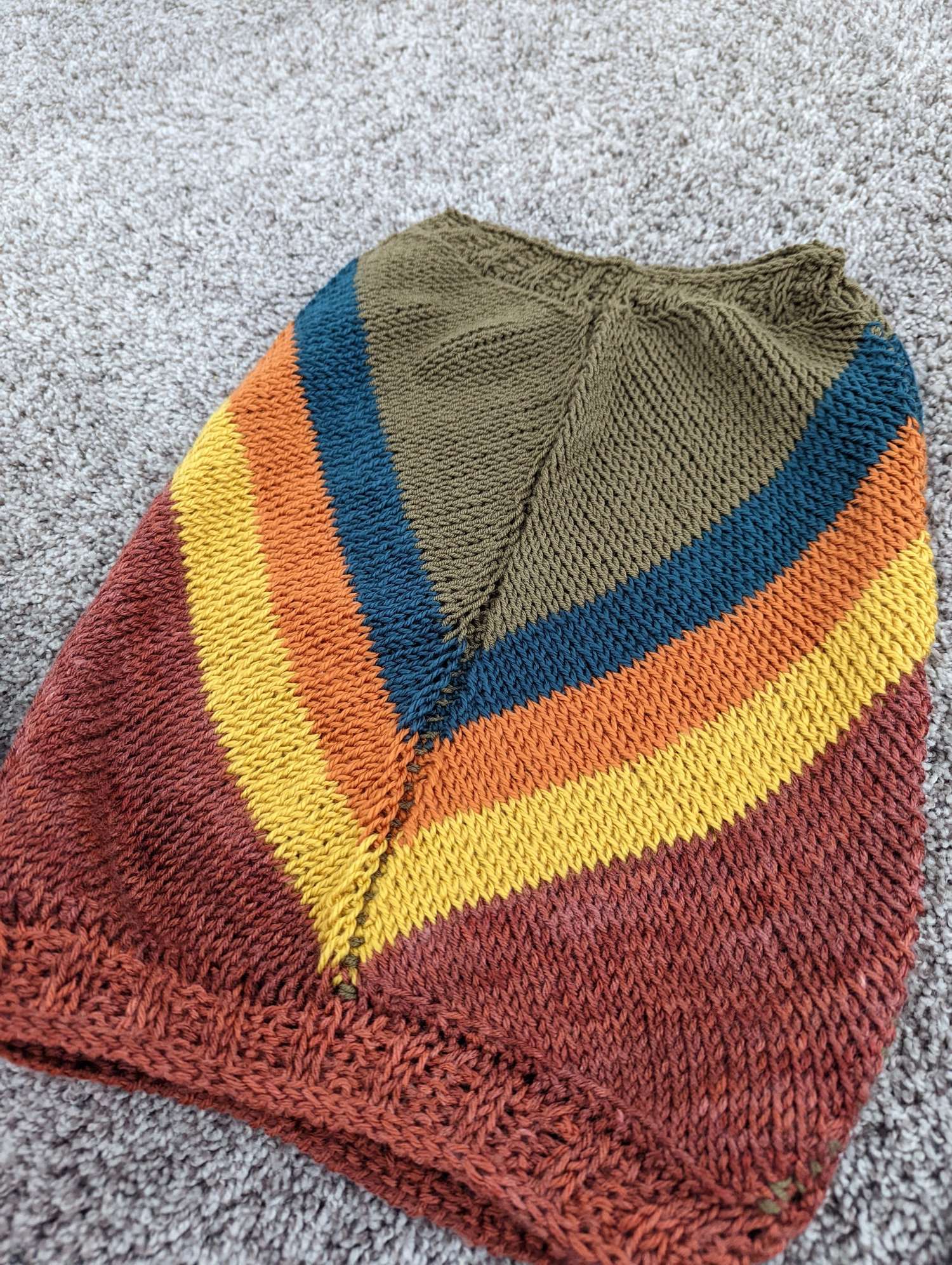 It uses a 6mm Tunisian crochet hook for the small, and a 6.5mm for the large, along with a 20” cord and a stopper. Gauge for the small size is 15 sts x 17 rows and for large is 14 sts x 16 rows all in Tunisian knit stitch, 4” square.