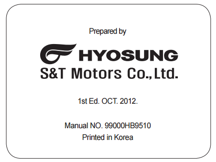 2012 Hyosung GV650 Pro GT 650 /P/S/R EI Service Manual Part No. 99000HB9510