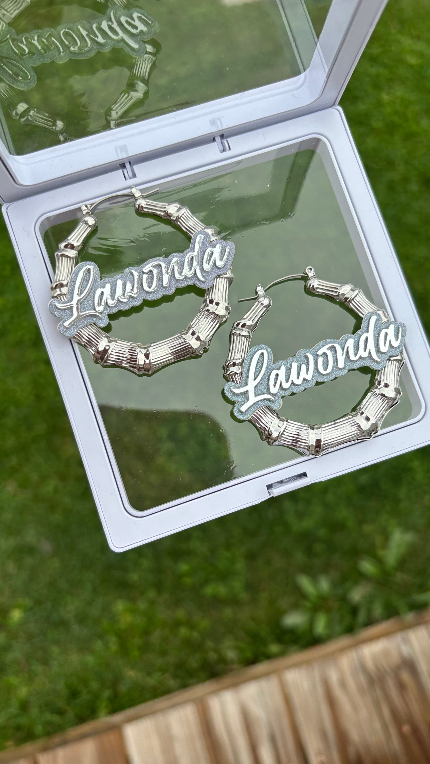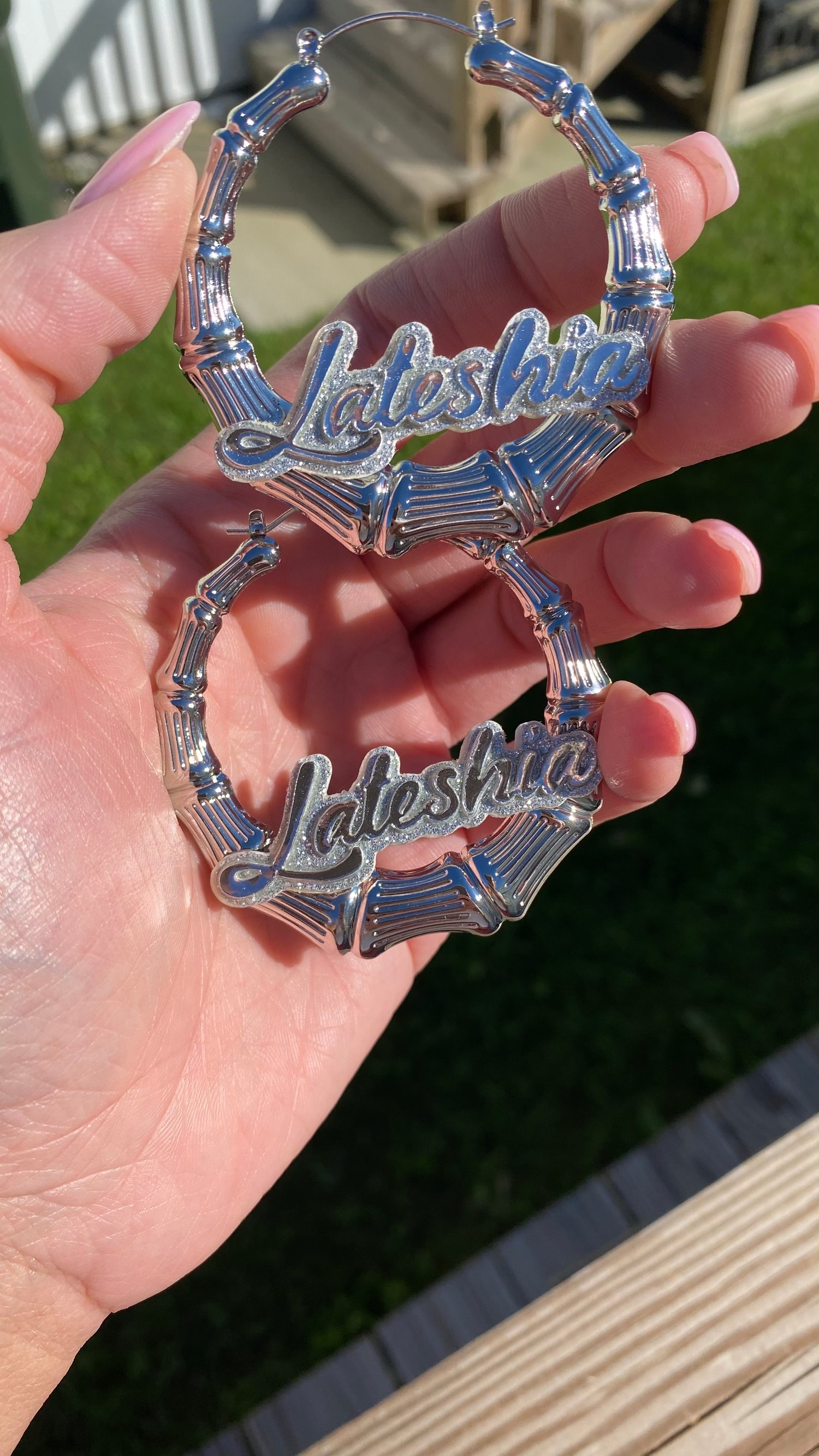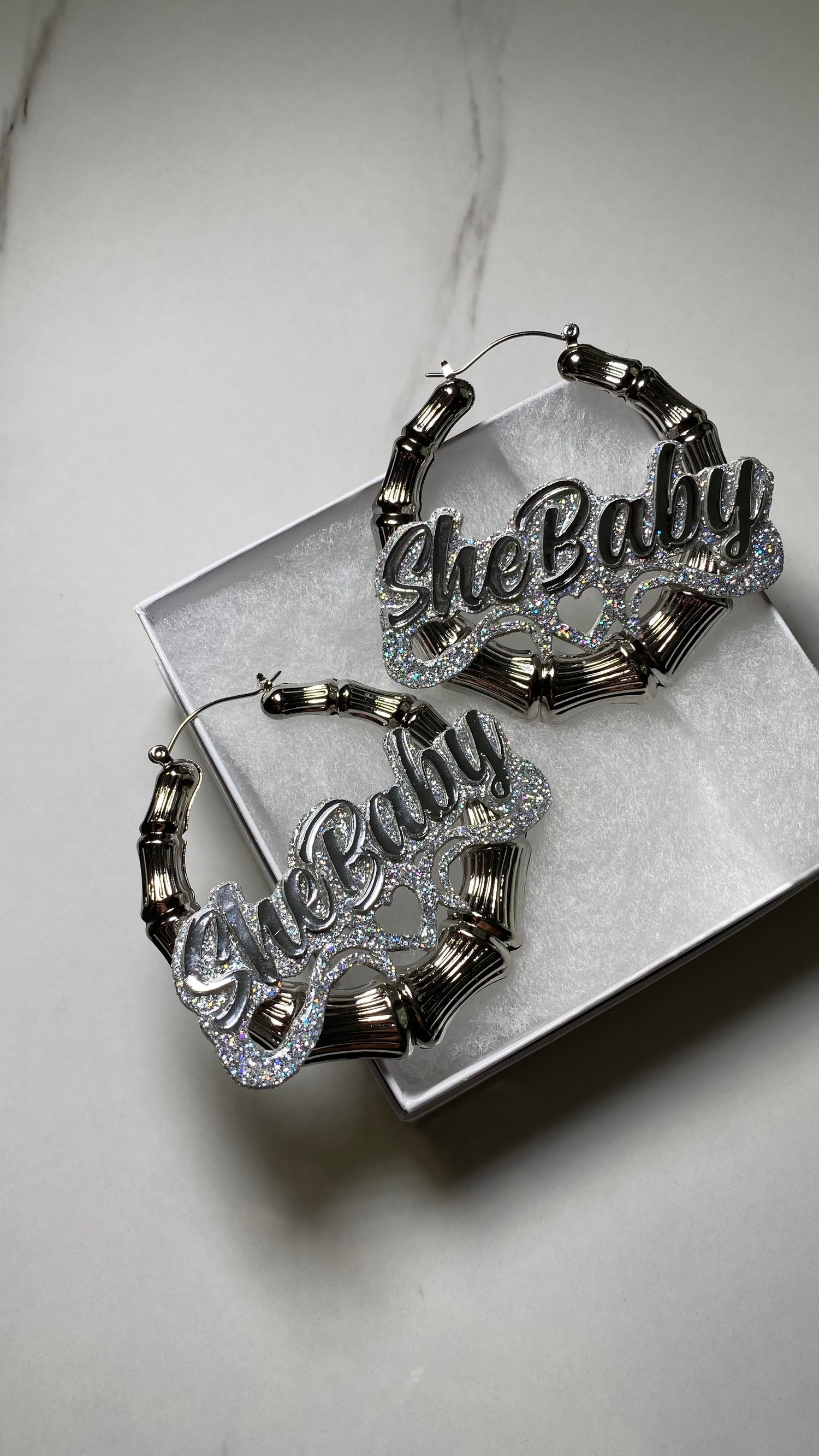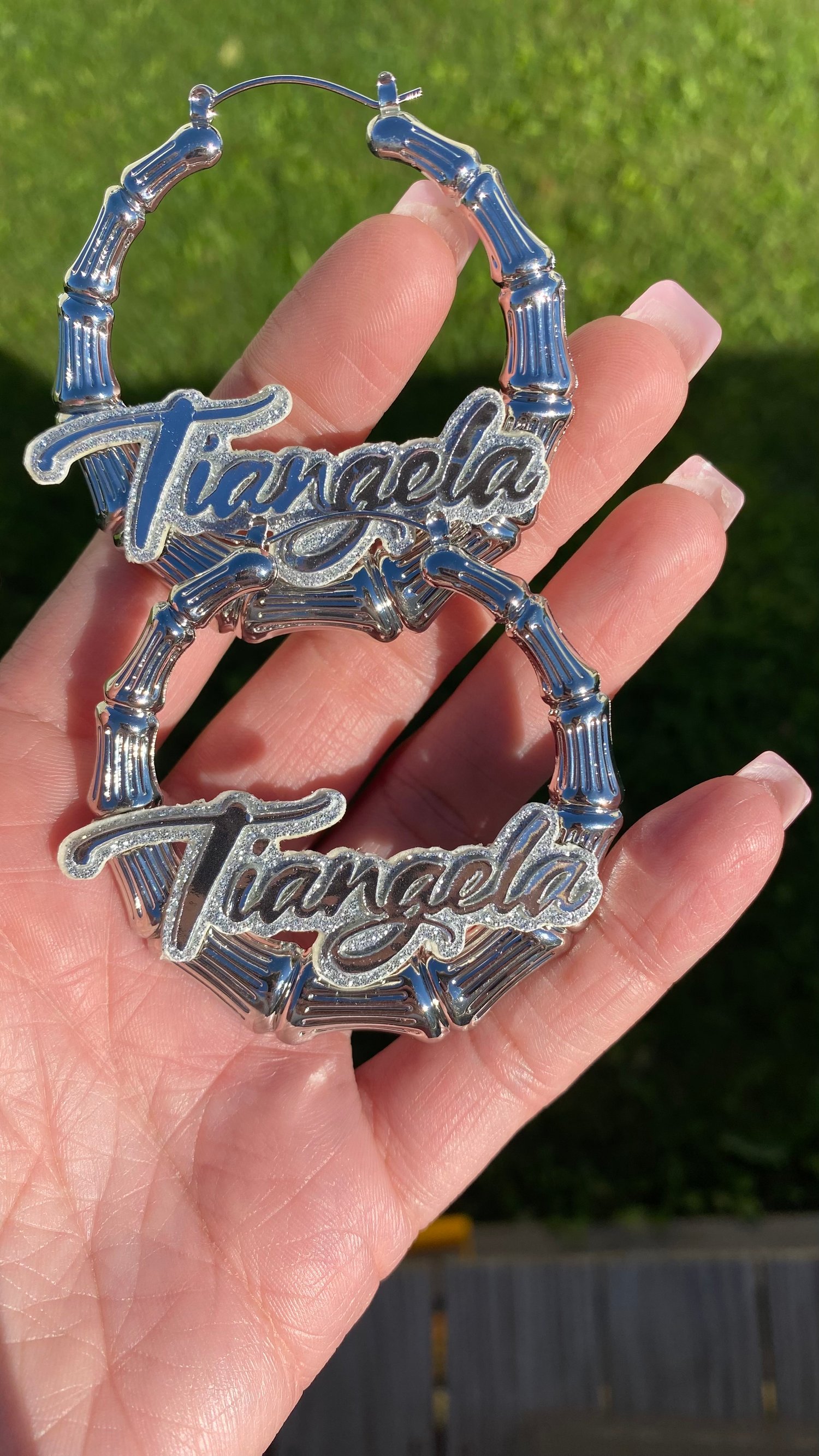 2inch Silver Bamboo Earrings With double layer Background or All glitter background and silver name font!