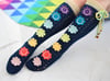 YARN: Fingering weight / Sock-friendly yarn blend with nylon — approx. 400 m (435 yd) per 100 g (3.5 oz). I used Berroco Vintage Sock (main color: 12182 Indigo), and Uni Merino Mini by Universal Yarns (contrasting colors: 102 Driftwood, 107 Conch, 145 Lipstick, 115 Duckling, 121 Tree Frog, 124 Glacier, 126 Dragonfly, 135 Scarab). Yarn requirements are listed per size/style below.