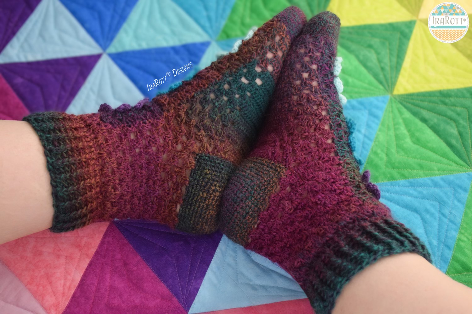 • Construction — These toe-up socks are worked in joined rows, with each row attached to the instep strip as you go. Construction begins with the heels, toes, and instep strips. Once prepared, the foot, gusset, leg, and cuff are worked in one continuous piece, attaching to these components as you progress. To help the socks last longer, the soles are worked using linked dc stitchers for extra strength.