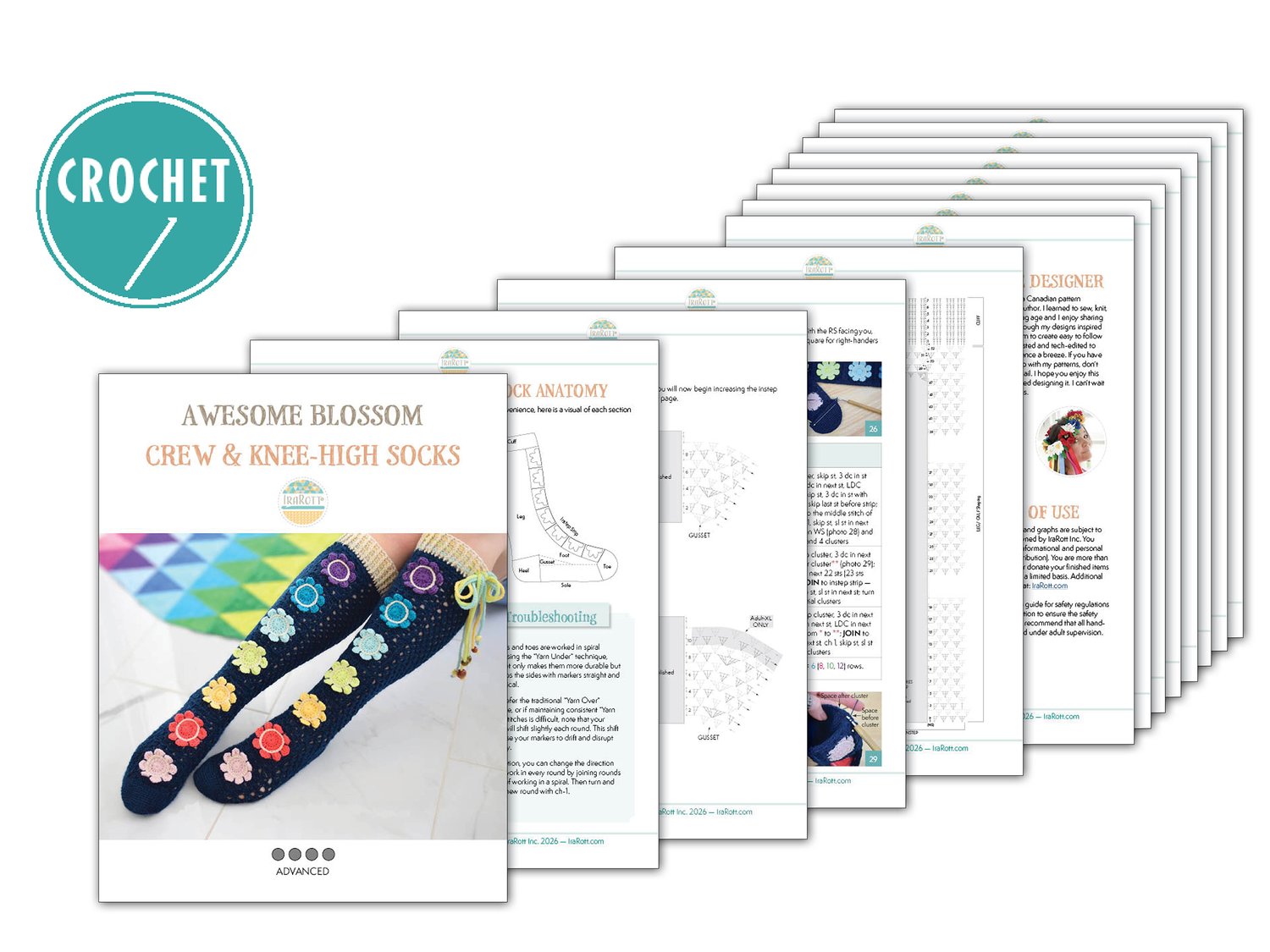 Welcome the sunshine with Awesome Blossom Socks, an elegant granny stitch design with floral charm! This pattern features an openwork granny stitch body for breathable, lightweight wear, while linked double crochet soles add extra durability for long-lasting comfort. Designed in two styles (Crew and Knee-High) and 4 adult sizes (S–XL), this pattern lets you create socks that feel just as good to wear as they look. Perfect for confident crocheters looking for a fun, wearable challenge.