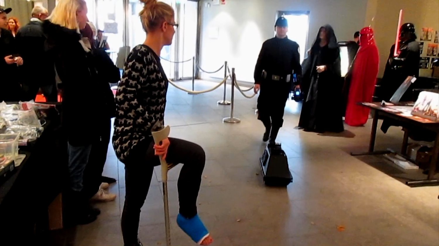 Sarah is on a movie exhibition and we see her standing with her crutches and SLC when a parade of characters from Star Wars and other movies passes her by.We follow her as she crutch around between the sellers and when she stops to watch DVDs and hangs up her casted leg we get a great close up of her cast and painted toes