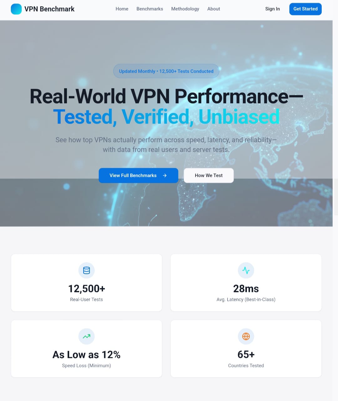 A visually stunning, responsive landing page template showcasing real-world VPN performance tests (speed, latency, stability) with interactive comparisons, data visualizations, and clean UI—perfect for tech reviewers, affiliate sites, or SaaS tools.