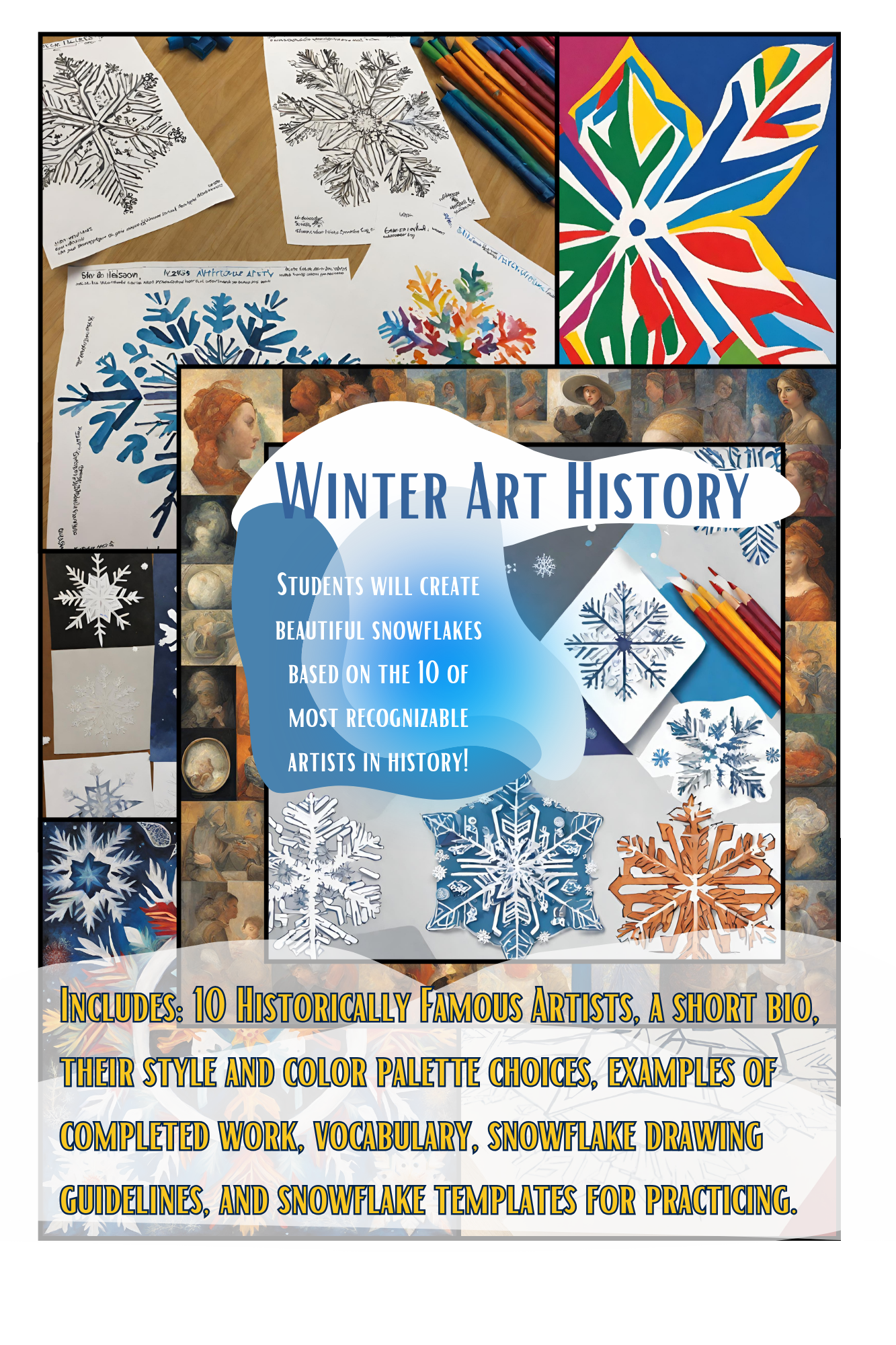 Students will embark on a captivating exploration of art history by creating snowflakes inspired by the distinctive styles of 10 renowned artists.