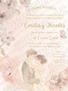 El diseño presenta ilustraciones florales suaves y una pareja romántica, transmitiendo ternura y elegancia sin verse recargado.