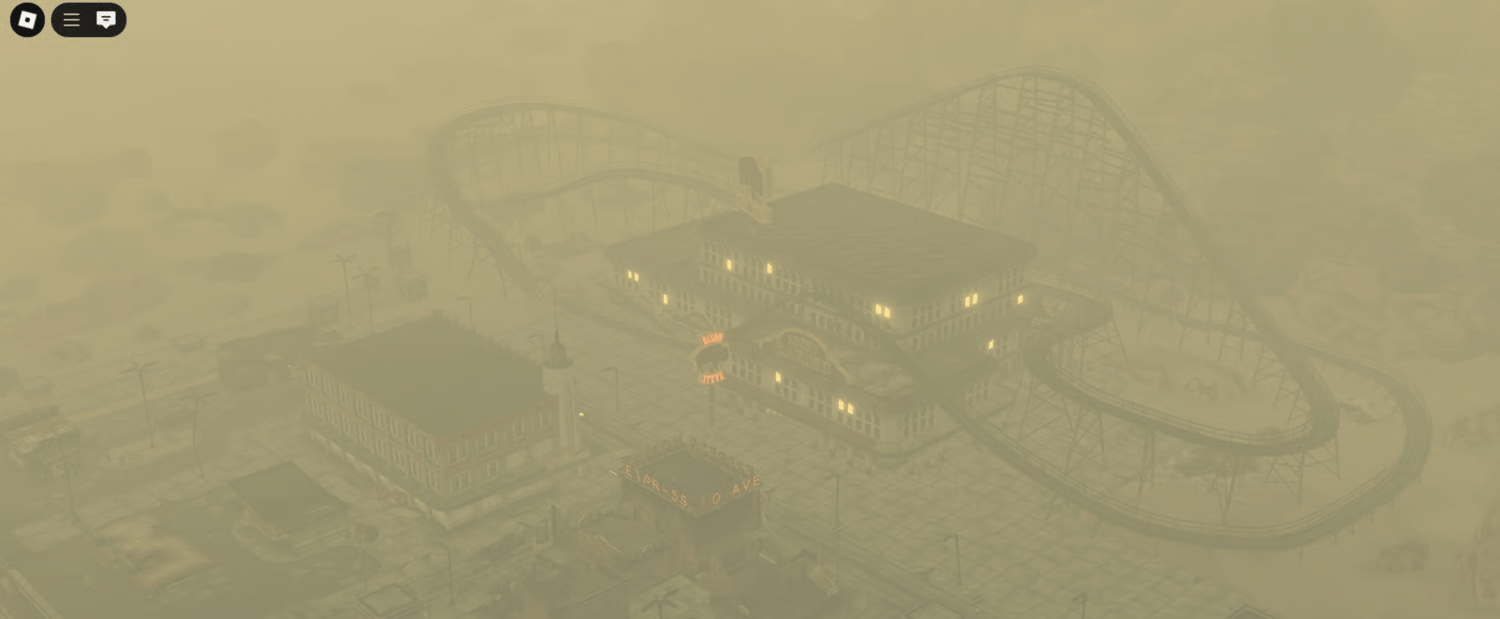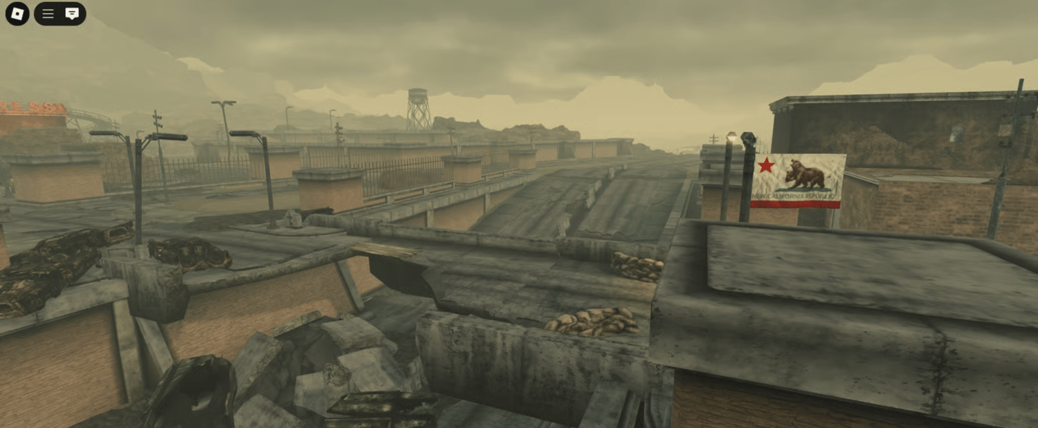 A massive post-apocalyptic desert city sprawling across the Mojave wasteland, featuring ruined casinos with neon signage, an abandoned roller coaster, fortified military outposts, and dusty ranches with cattle. The environment includes detailed interiors with peeling walls, vintage posters, retro terminals, and worn wooden counters. A cracked highway stretches through the haze past roadside diners and faded billboards while sandbag barricades and barbed wire fencing mark faction territories. Warm dusty atmosphere with heavy fog and muted lighting creates an immersive post-nuclear tone throughout. Perfect for survival games, post-apocalyptic RPGs, wasteland roleplay, shooter maps, or cinematic showcases.