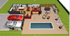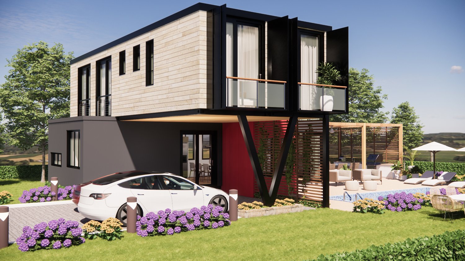 This modern house plan is an architectural masterpiece designed using four 40-foot shipping containers. The containers are stacked two-on-two in a cruciform layout to create a modern container floor plan with 3 bedrooms, 2.5 bathrooms, and an open-plan living area. The house has a covered front porch and an open family terrace at the top. Additionally, the house boasts a swimming pool on the rear, surrounded by a spacious pool deck area and outdoor living space perfect for entertaining.