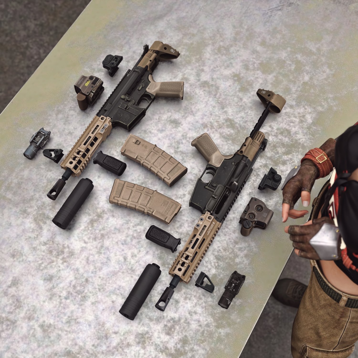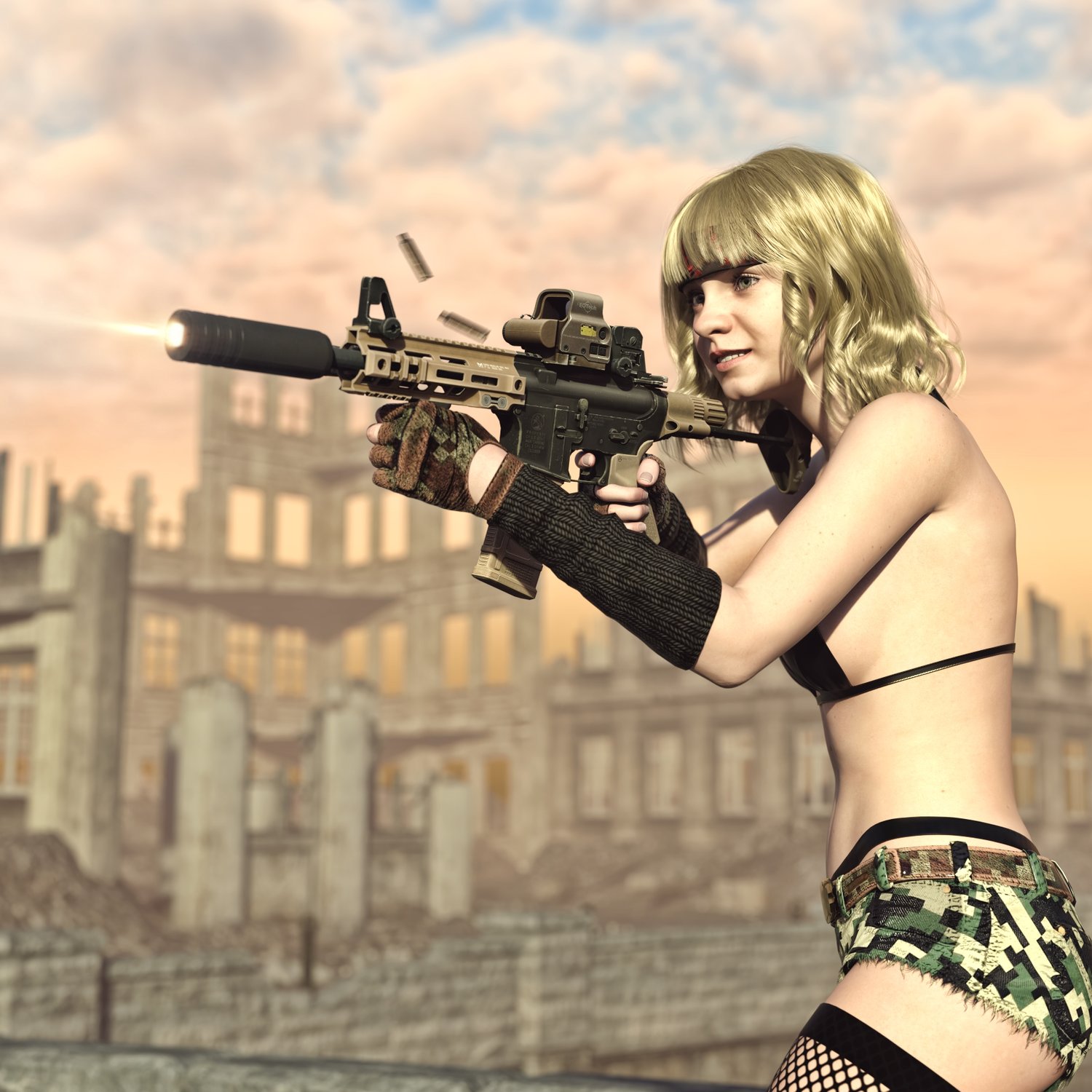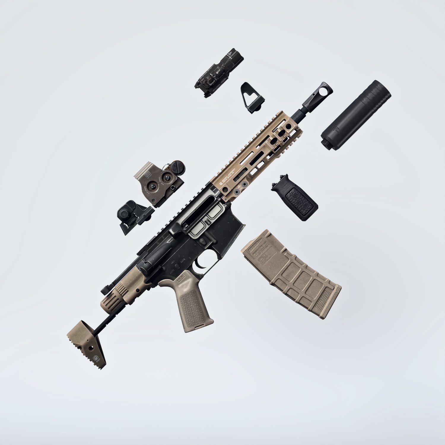 A short tactical variant of the classic AR 15 assault rifle, this time in 300blackout. Full power assault rifle cartridge in a very short and compact package. Converted and rigged for use with DAZ. Trigger, safety, bolt etc also rigged for more realistic pictures. Includes various accessories, such as silencer, a red dot, a light, front grip and rigged iron sights for various porpoises and pictures. Since parts are rigged, the gun can be used as just the basic configuration or an upgraded modern variant.