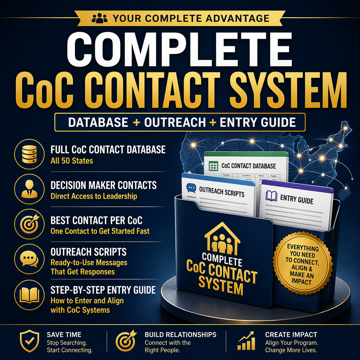 This system shows you exactly who to contact and how to approach them.Stop guessing how to connect with Continuum of Care (CoC) systems.