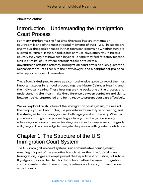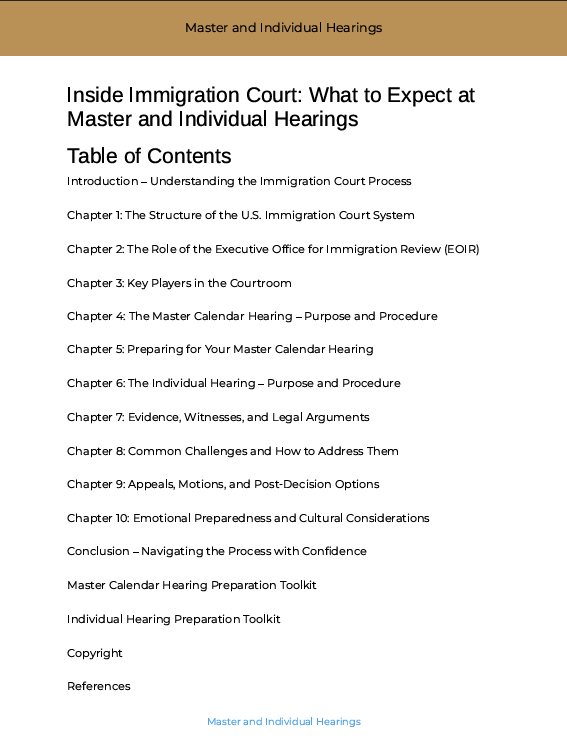In "Master and Individual Hearings," readers navigate the critical immigration court process where each decision can alter lives forever. This essential guide demystifies the courtroom environment, outlining key players, procedures, and strategies for effective emotional and legal preparation. With insights on overcoming systemic challenges and achieving justice, it empowers individuals to approach their hearings with clarity and resilience.