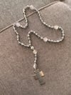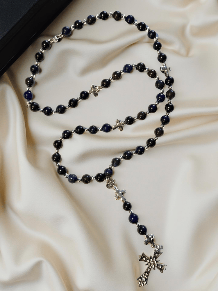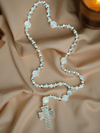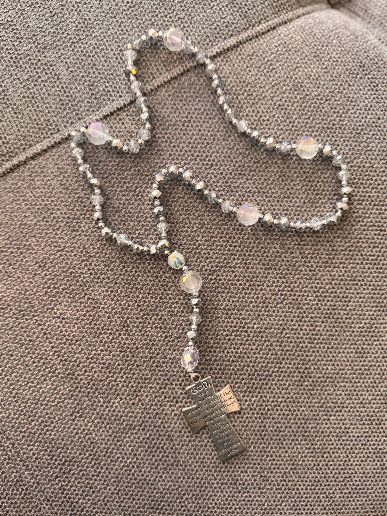 Ethereal handmade rosary featuring iridescent angel aura crystal beads with rainbow shimmer. Premium cord-based construction with special Serenity Prayer cross. Unique inspirational design combining beauty with meaningful scripture.