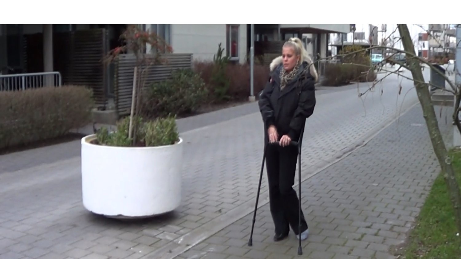 Ice crutch in the neighborhood on the way home.The first thing she do when she enter the apartment isremoving her shoe and sock on her right foot and then the sock over her blue SLC.After entering the bedroom and changing, Ice comes jumping on one leg from the room holding her casted leg in the air.We see her do some daily routines in the kitchen before we say goodbye to Ice for this time