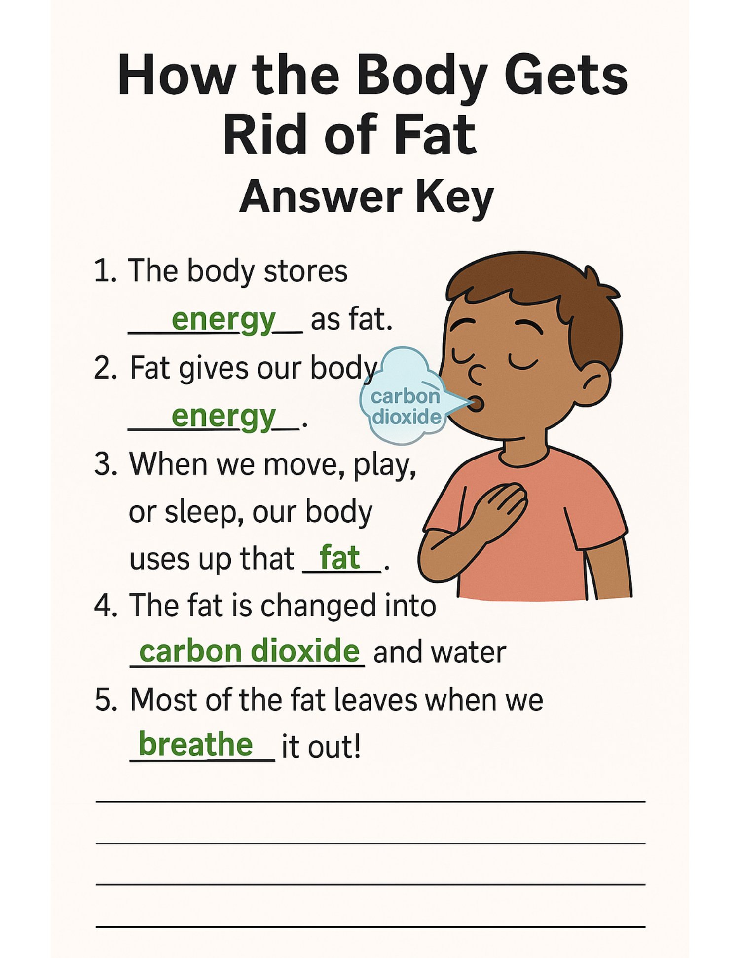 The materials make it easy to teach health and body science concepts in a clear, visual, and age-appropriate way. Students will learn where fat comes from, how it’s used for energy, and how it leaves the body through breathing, water, and movement.
