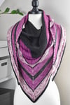 ASHLAND is a sizable triangle shawl with a wide variety of stitches and color changes to keep your interest, worked with 3 colors of fingering weight yarn. High contrasting colors are recommended.