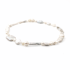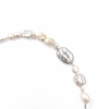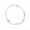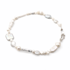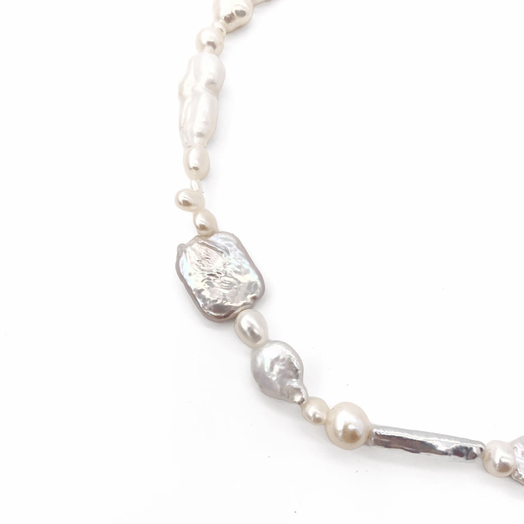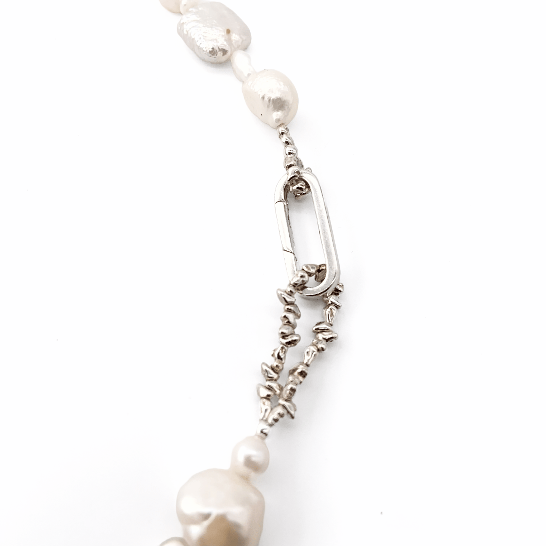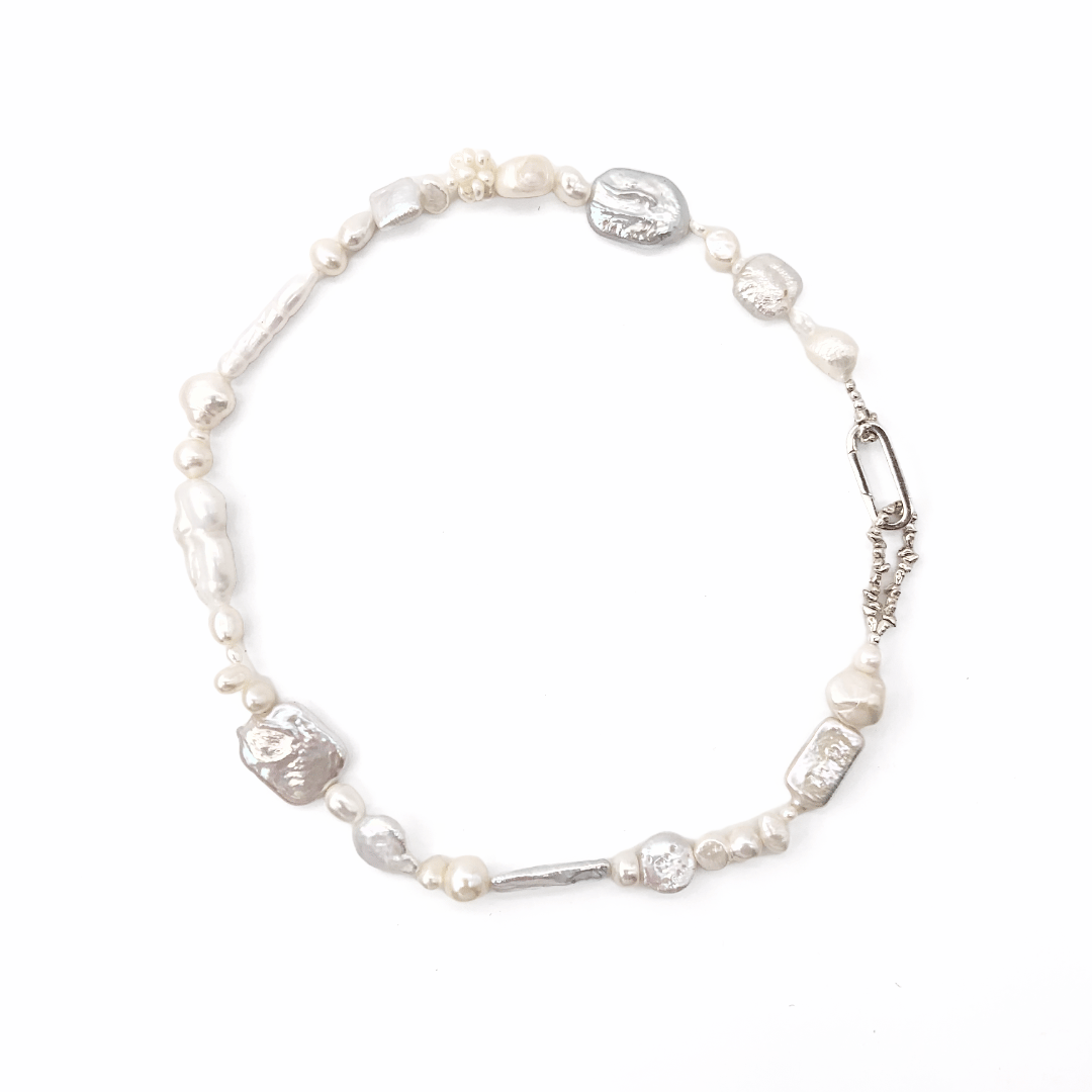Fragments of silver shimmer quietly between freshwater pearls, composing a necklace of rhythm and soft spaces.